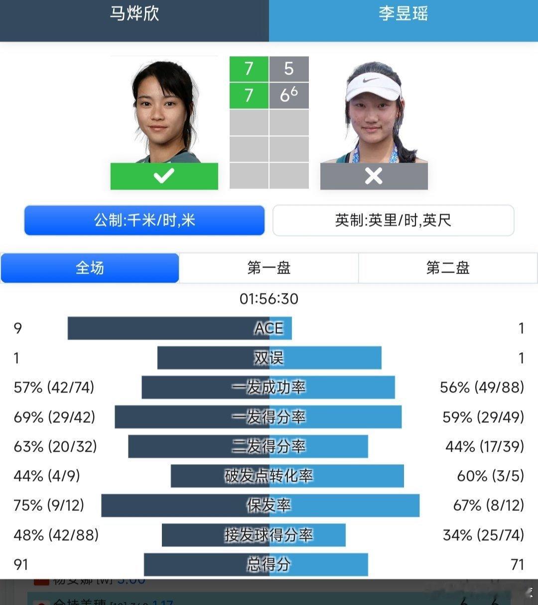 马烨欣🇨🇳7-5/7-6(6)战胜李昱瑶🇨🇳,晋级决胜轮,恭喜马烨欣!🎉🎉🎉