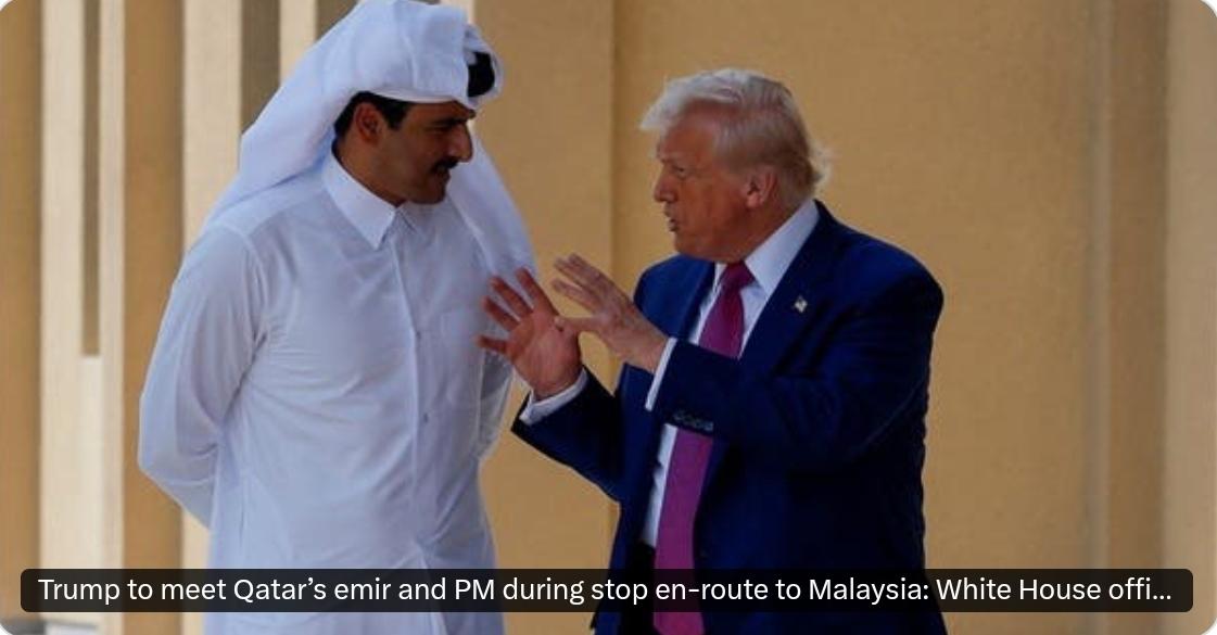白宫官员称,唐纳德·特朗普总统将在空军一号上与卡塔尔埃米尔和首相会面,该航班将在卡塔尔加油期间经停,前往马来西亚参加地区峰会。