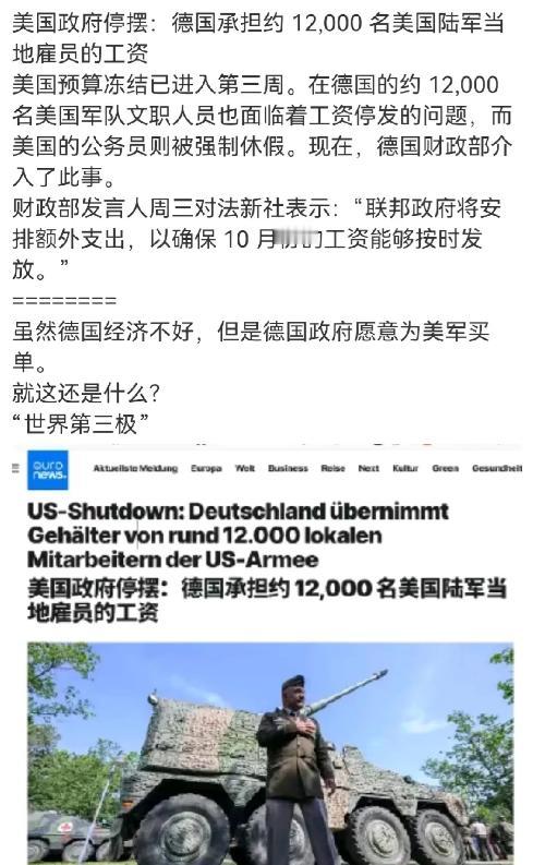 德国真的不是当年的德国了,德国居然给美国的12000名驻军发工资,因为美国政府停摆,发不了工资,结果德国自己主动承担了这12000名美军的工资,只能说德意志民族的精气神已经不复存在了 德国作为北约在欧洲的战略支点,境内驻扎着约3.5万名美军士兵,而支撑这些驻军正常运转的,是1.1万名德国本地文职雇员。 从基地食堂的日常供应、军用物资的运输调度,到营区的安保巡逻、消防应急,再到医疗保障和信息技术维护,这些雇员的工作覆盖了基地非军事领域的所有关键环节,堪称驻德美军的“后勤基石”。 按照美德双方的约定,这些雇员的薪资本该由美国方面审批发放,但政府停摆导致所有款项流程彻底卡壳,10月份的工资眼看就要落空。 驻德美军基地的战略价值不言而喻,拉姆施泰因空军基地是北约在欧洲最大的空军基地,斯图加特则是美国欧洲司令部的所在地,凯泽斯劳滕警备区更是美国在海外规模最大的军事社区。 其中,莱茵兰-普法尔茨州是美军驻军最集中的地区,当地的基地雇员占德国境内总数的一半以上。 一旦这些雇员因欠薪停止工作,不仅会让士兵们面临吃饭、医疗等基本保障短缺的问题,更可能导致战机零件无法运输、营区安全无人值守的严重后果,整个基地的运转将瞬间陷入瘫痪。 面对这一困境,德国服务行业工会率先站了出来。 工会明确表示,按照德国劳动法和北约《驻军地位协定》,雇员理应按时获得报酬,以往美国政府停摆时,薪资发放从未出现问题,但这次特朗普政府迟迟没有给出明确的批准信号,这种情况已经涉嫌违法。 在工会的敦促下,莱茵兰-普法尔茨州政府率先行动,紧急联系德国联邦财政部,推动建立薪资保障机制。 最终,德国联邦政府与地方政府达成协议,决定启动一项非计划性支出,先行为这些雇员垫付10月份的工资。 为了落实这一举措,德国财政部专门准备了约5000万美元的紧急资金,覆盖所有驻德美军基地的本地雇员。 德国官方明确表示,这笔钱属于临时垫付,一旦美国政府恢复运转,将向美方申请全额报销,这一行为被定义为“对驻德美军及其文职雇员的团结支持”。 德国的这一举措,显然不是盲目妥协,而是基于现实利益的理性选择——一旦这些雇员因欠薪罢工,整个基地的运转将陷入停滞,不仅会削弱北约在欧洲的防御能力,还会直接冲击德国当地的就业和经济秩序,毕竟这些基地能为地方带来大量就业岗位和经济活力。 外界曾普遍误解德国精英渴望摆脱美国驻军,实现所谓“正常国家”地位,但事实恰恰相反,德国上层对美军的存在早已形成深度依赖。 这种依赖并非源于军事威慑,而是基于战略利益的深度绑定——驻德美军不仅是北约集体防御体系的重要组成部分,更是德国应对地区安全风险的“定心丸”,尤其是在俄乌战争持续的背景下,这些基地的稳定运转对德国的安全环境至关重要。 有分析指出,若是有一天美国主动提出撤军,德国很可能会成为首个站出来反对的国家。 德国的垫付行为暂时稳住了局面,让一万多名本地雇员不用再为房贷、学费和医药费发愁,也保障了驻德美军基地的正常运转。 但这场由美国国内政治斗争引发的跨洋危机,终究不该由别国来买单,而美国信誉的裂痕和欧洲战略的迷思,恐怕不是一笔垫付的工资就能轻易弥补的。 今天的分享到这里就结束了,大家对此事有何看法,欢迎在评论区留言和讨论,感兴趣的可以点击头像加关注,我将每日更新优质内容,我们下期见。