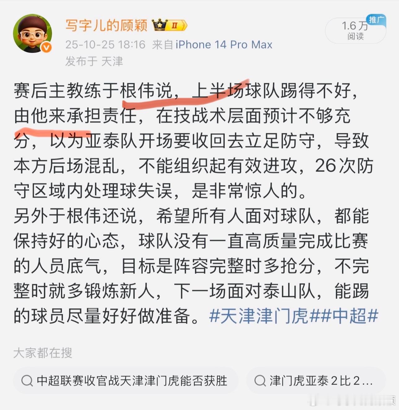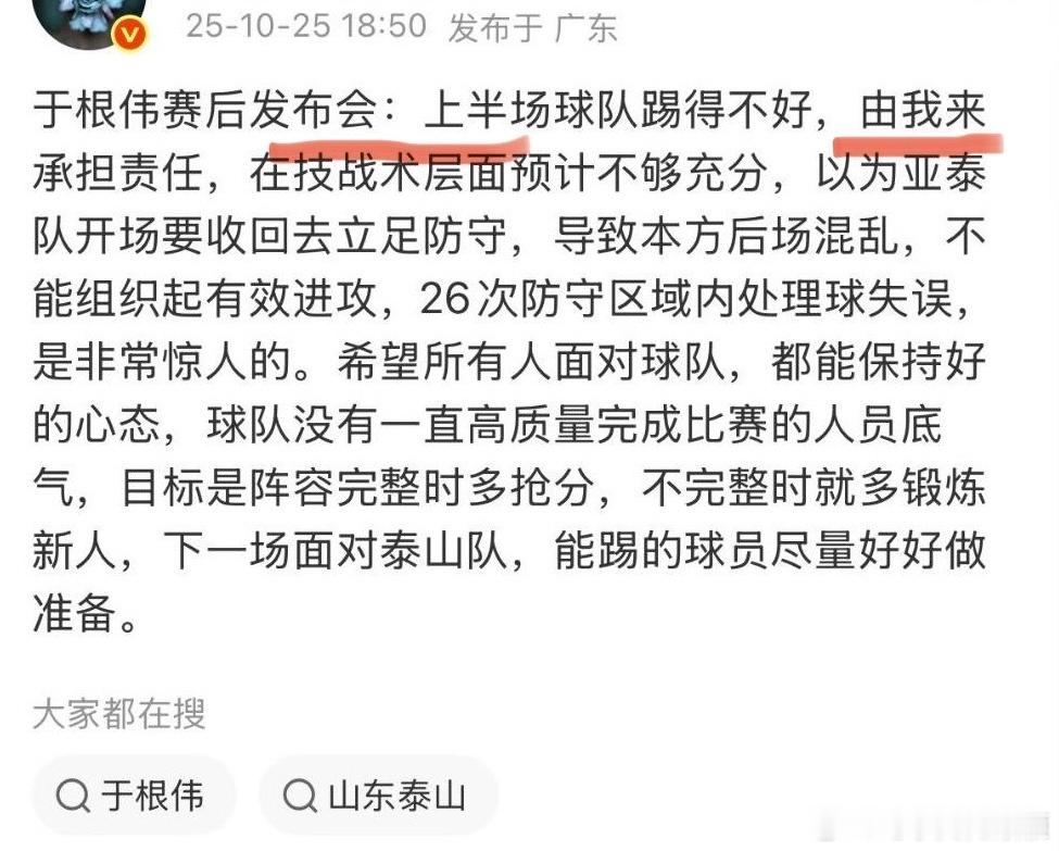 赛后新闻发布会后不久,我微博发了一部分于指导说的内容,因为不是原话记录,算内容转述,所以我没用第一人称直接引语。