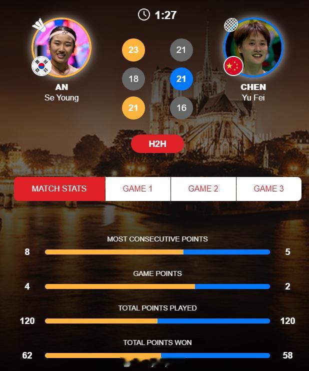 【法国羽毛球赛陈雨菲鏖战三局1-2惜败安洗莹 无缘决赛】2025年法国羽毛球公开赛陈雨菲止步法国赛半决赛 陈雨菲1比2安洗莹 10月25日瑟松塞维涅,2025世界羽联超级750法国公开赛女单半决赛,经过将近90分钟鏖战,陈雨菲以21-23/21-18/16-21惜败同样力竭的安洗莹,无缘决赛。安洗莹将与王祉怡争夺冠军。后者在另一场半决赛中,以21-14/20-22/21-14击败队友韩悦。