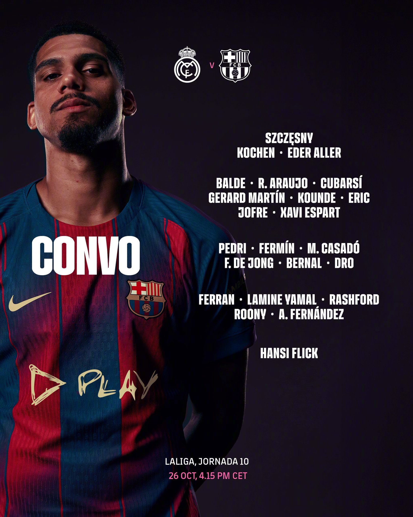 ❌特尔施特根、乔安·加西亚、奥尔莫、加维、拉菲尼亚、克里斯滕森、莱万缺阵