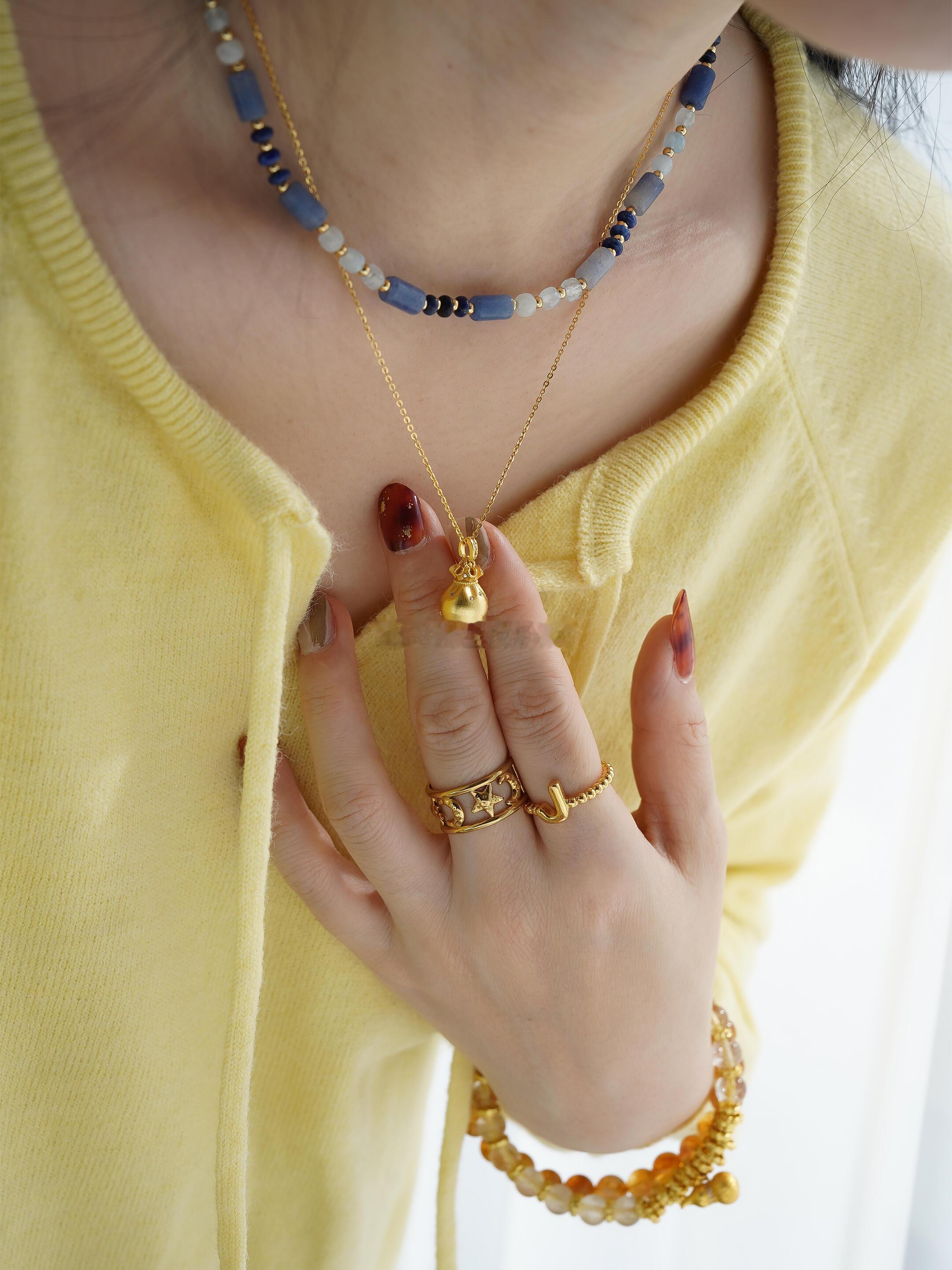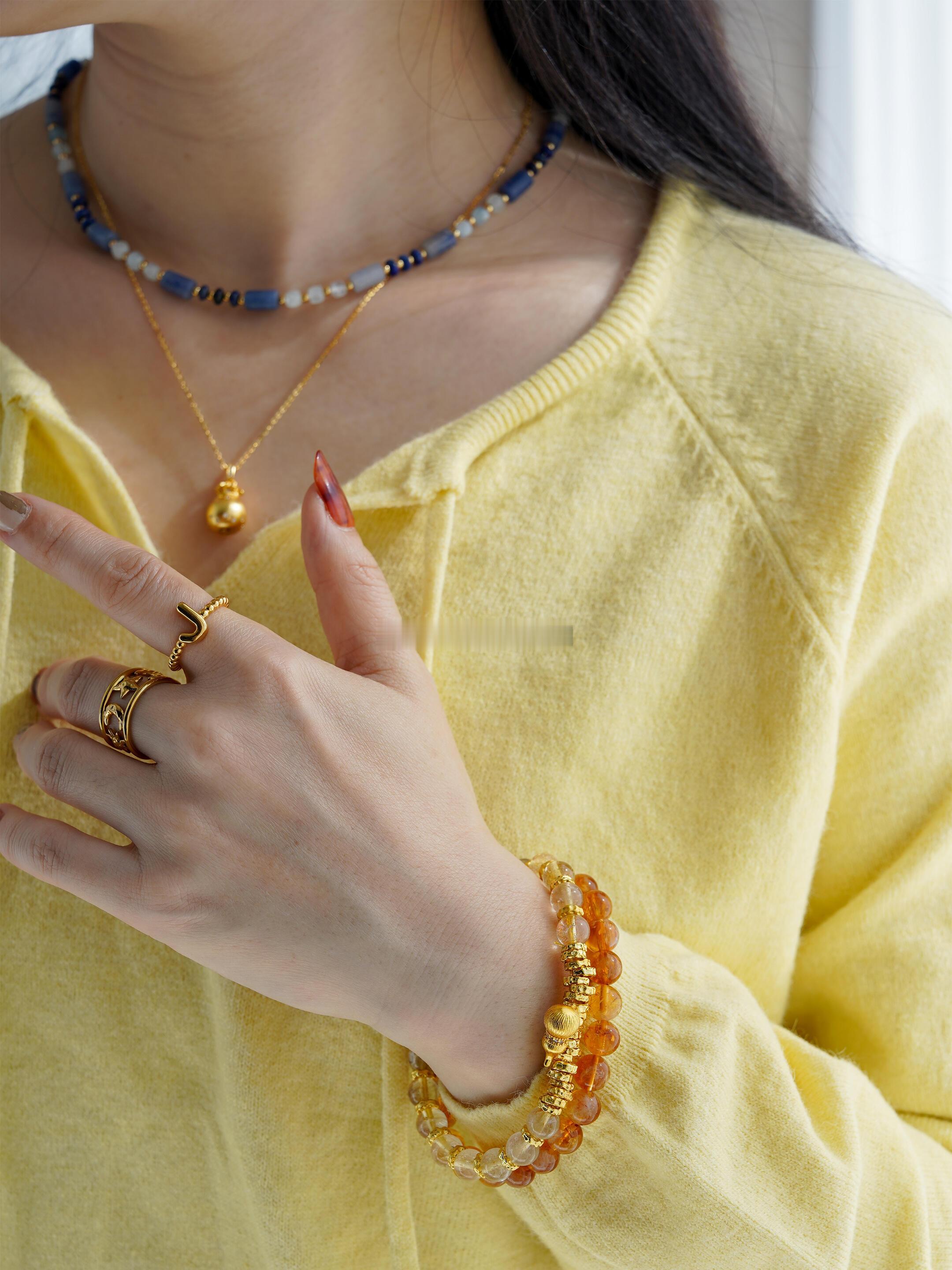 葫芦象征福禄,搭配的金色小珠子blingbling的,刚好和钱袋子项链呼应,整套配饰看起来特别和谐,戴在手上显白又讨喜。