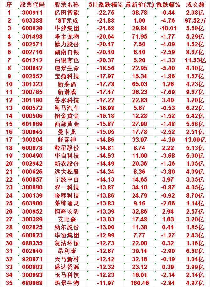 本周,整个市场“跌幅最多”的35名单 亿田智能:5日跌幅 22.75%,成交额 2.08亿元 *ST元成:5日跌幅 21.88%,成交额 97.52万元 华建集团:5日跌幅 21.68%,成交额 5.59亿元 乖宝宠物:5日跌幅 20.64%,成交额 5.29亿元 德力股份:5日跌幅 20.47%,成交额 1.52亿元 湖南白银:5日跌幅 20.40%,成交额 8.67亿元 白银有色:5日跌幅 20.37%,成交额 11.53亿元 透景生命:5日跌幅 18.56%,成交额 4.10亿元 宝鼎科技:5日跌幅 17.97%,成交额 1.57亿元