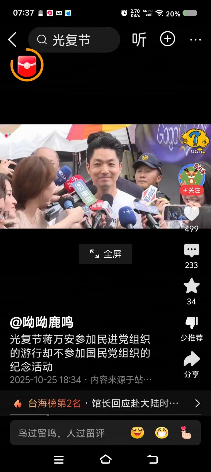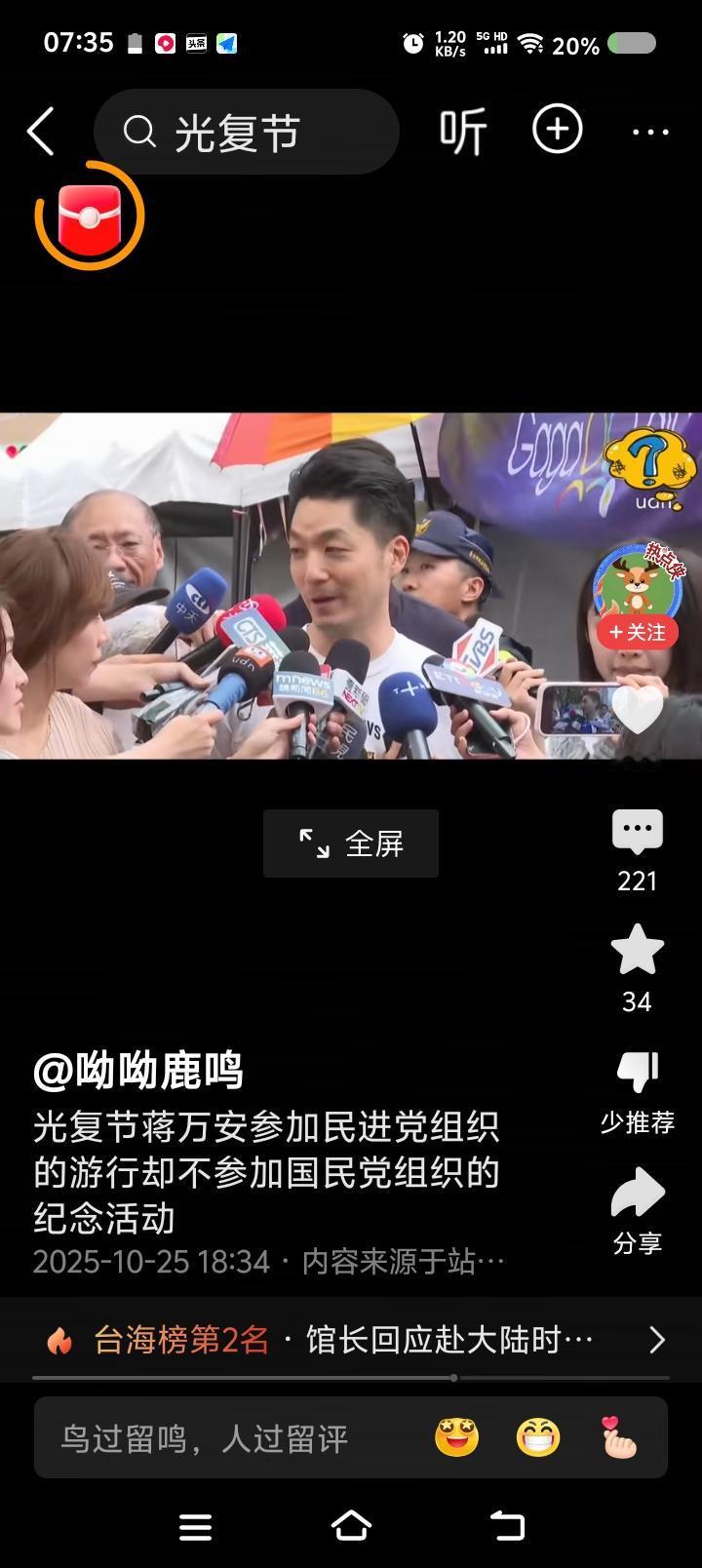 蒋万安,真有出息!—— 据报道,台湾光复纪念日,台湾省官方静悄悄。中国国民党悄悄办了一些活动,党主席朱立伦对大陆设台湾光复纪念日冷言冷语。国民党员蒋万安更离谱,参加民进党组织的活动。 点评: 蒋万安参加的活动具体什么内容,不知道。 我看到另一个网上视频:此次台湾光复纪念日,台湾民进党组织同性lian大游行。 如果蒋万安参加了这样的活动,不是对先烈的不敬吗?太恶心了!