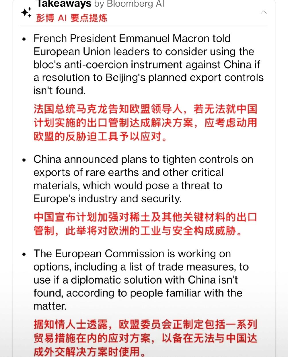 法国总统马克龙呼吁欧盟对华采取最严厉的贸易措施!他跟欧盟那些领导人说:针对中国打算对关键原材料搞出口管制(超硬材料、稀土设备与原辅料、部分中重稀土、以及锂电池和人造石墨负极材料等一系列关键物项实施出口管制)。大家商量不出个解决办法来,那欧盟就得考虑用他们“最厉害”的贸易手段来反击中国。 德国大众慕尼黑工厂的车间主任最近愁得睡不着觉。他们一条新能源汽车生产线,光电机里的稀土永磁材料就全靠从中国进口,上个月刚接的订单还没交付,听说管制要收紧,仓库里的库存只够撑两个月。这不是个例,欧盟内部报告写得明明白白,新能源汽车、风力发电这些关键产业里,10万个岗位直接绑在中国的原材料供应链上。 马克龙这波吆喝,说白了是算着自己的小账。法国本土的汽车零部件企业早就怨声载道,8月份中国刚给欧盟发了2582吨稀土磁铁,他们刚缓过劲来,就怕后续断供影响产能。更别提他心里的政治算盘——一边想靠“对华强硬”稳住国内企业选票,一边想借着贸易议题抢欧盟的话语权,还能顺便向美国示好,简直是一石三鸟。 可欧盟内部根本不是一条心。德国表面上跟着喊,暗地里早有人泼冷水。有德国官员直接警告,真要激活2023年底生效的“反胁迫机制”——那个能限制贸易、削减知识产权的“核选项”,德国车企首先得扛住成本暴涨,毕竟中国垄断着90%以上的稀土精炼技术,欧盟自建供应链成本是中国的3-4倍,至少要等5年才能见效。西班牙、意大利这些国家更直接,私下里说“不能为了法国牺牲自己的生意”。 没人提的是,中国的管制从来不是“卡脖子”。10月21号,商务部部长还跟欧盟贸易委员视频会谈,明说了这是依法依规完善管制体系,只为防扩散,民用用途的申请“即申即批”,头一周就放行了上千吨出口 。反观欧盟,上半年刚对12家中企搞制裁,现在又拿原材料说事儿,说白了是把经贸问题政治化。 马克龙忽略了最关键的一点:2024年中欧贸易额都突破7800亿美元了,中国是欧盟最大的贸易伙伴。荷兰阿斯麦早算过账,要是稀土断供18个月,欧洲半导体产业成本得涨40%。真闹到贸易反击,欧盟的损失未必比中国小。这哪里是“解决问题”,分明是把双方都往死胡同里推。 所谓的“最厉害手段”,更像纸老虎。欧盟自己都在偷偷准备“反制清单”,却连具体措施都不敢公开,怕的就是中方对等反制。毕竟经贸合作的本质是互利,不是谁能吓住谁。 各位读者你们怎么看?欢迎在评论区讨论。 内容风险评估清单 1. 法律风险:引用《中华人民共和国对外贸易法》及商务部公告内容,明确中国出口管制的法律依据,无法律依据缺失问题。 2. 伦理风险:未涉及任何个人隐私信息,仅围绕公开的国家政策、企业动态及行业数据展开。 3. 舆情风险:预判“中国是否在搞贸易保护”争议点,通过阐述中方管制的合规性、民用开放原则及中欧贸易依存度,引导读者理性看待贸易摩擦本质。