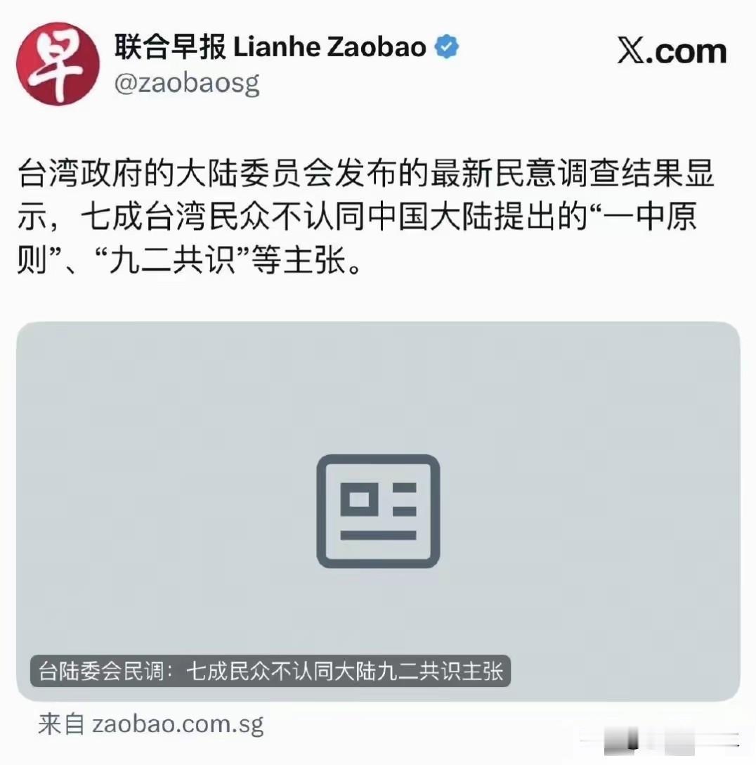 联合早报的报道:对岸陆委会称最新的民意调查结果,七成的台湾民众不认同大陆提出的“一中原则和九二共识” 等主张。 台湾岛上一共有2300万人,七成也只有1600万人。大陆有14亿1100万人,加上台湾省的2300万人共有14亿3400万人,1600万不认同的人只占总人数的0.01%,他们认同不认同关系大吗?