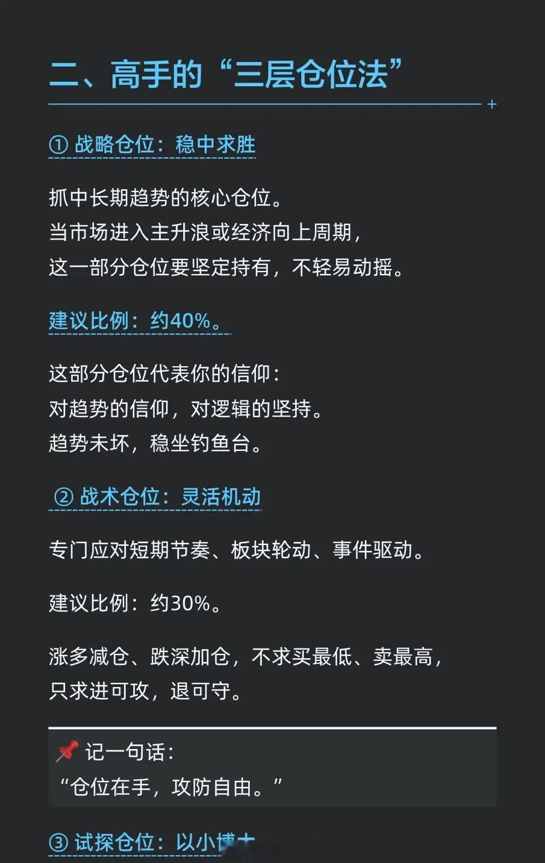 图片中提出了一个非常实用且经典的仓位分配模型——“三层仓位法”,分别是: