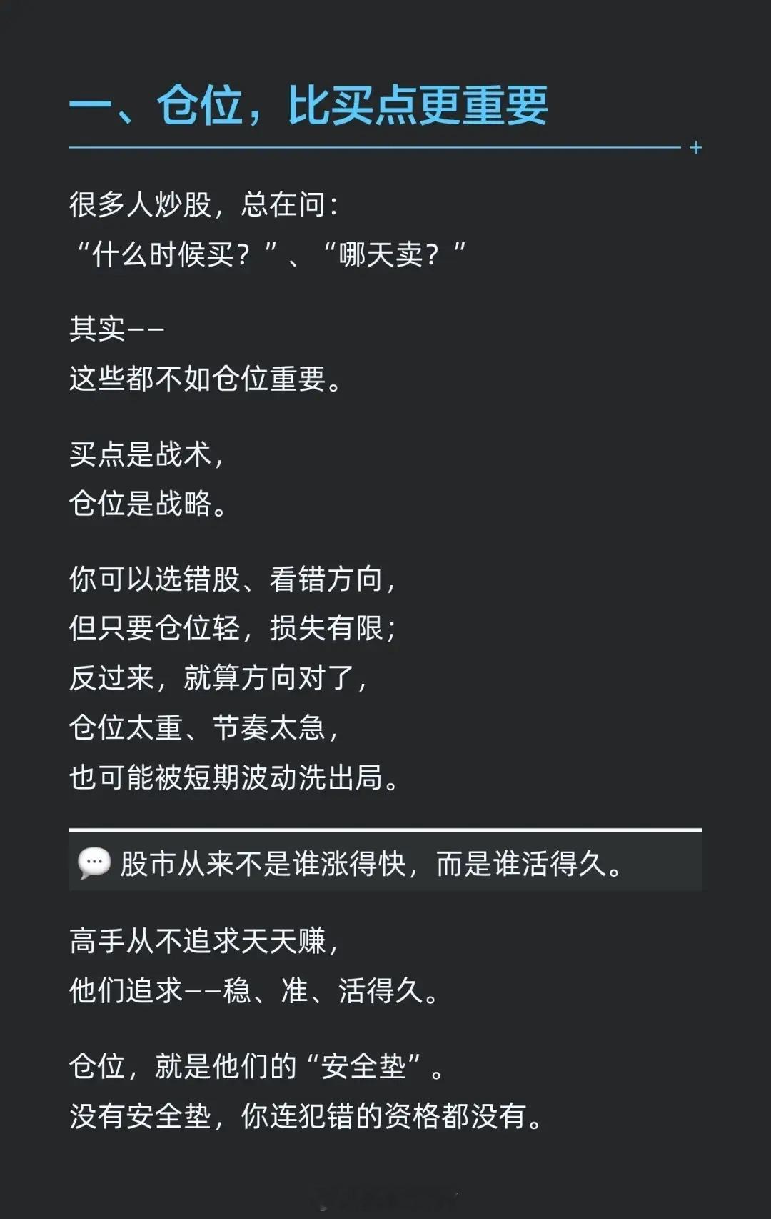 - 股市比的不是谁涨得快,而是谁能“活得久”。仓位是投资者的“安全垫”。