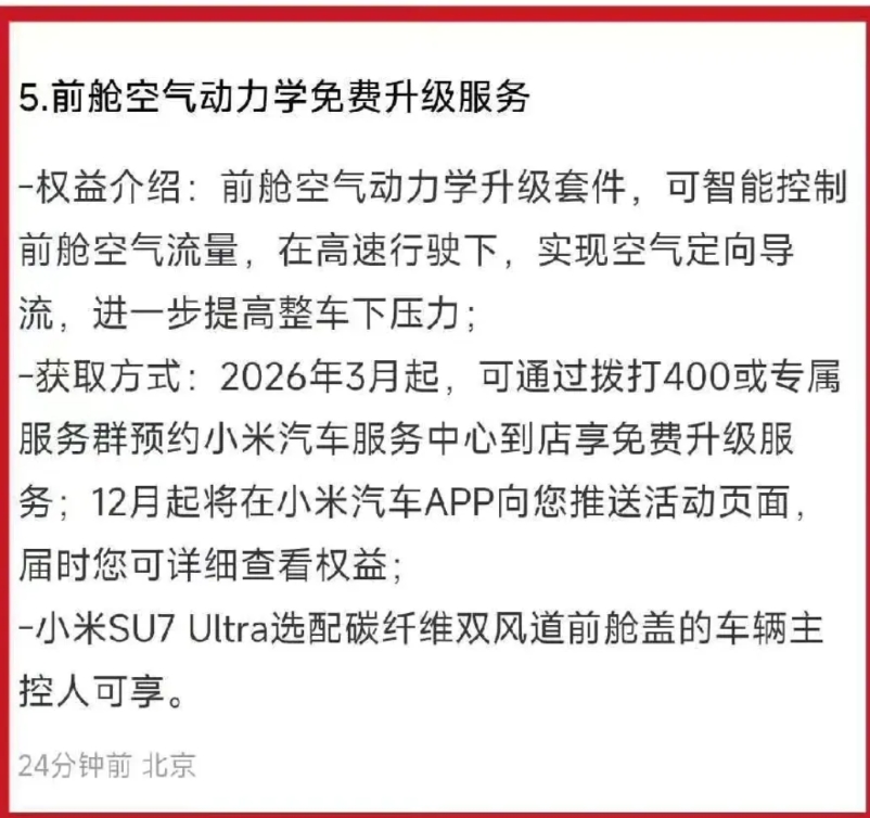 时隔几个月,小米SU7ultra车主终于可以使用上真正的碳纤维双风道前舱盖! 此前选装这个价值42,000元的车主发现里面并没有相关的风道结构,此次小米推出了空气动力学免费升级服务,在明年3月份就可以预约进行升级了。 此前的碳纤维双风道前舱盖只是一个装饰件,并不具备提供额外空气下压力的能力,此次升级就是为了弥补此前产品的不足之处。 让小米SU7ultra的选装件真正具有提供额外下压力的条件,这对于选装了42,000元的车主来说是不亏的。