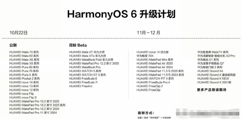 鸿蒙6.0的升级计划也官宣了,包含直板手机、平板、折叠屏、PC笔记本、耳机、手表等,具体型号的升级计划如下图所示。对于大家关心的老麒麟升级计划,目前还没正式官宣,虽然给那么多老机型升级确实要投入更多精力和时间,但还是希望华为终端能尽可能的给老用户老朋友升级,让老设备再发光发热一段时间。