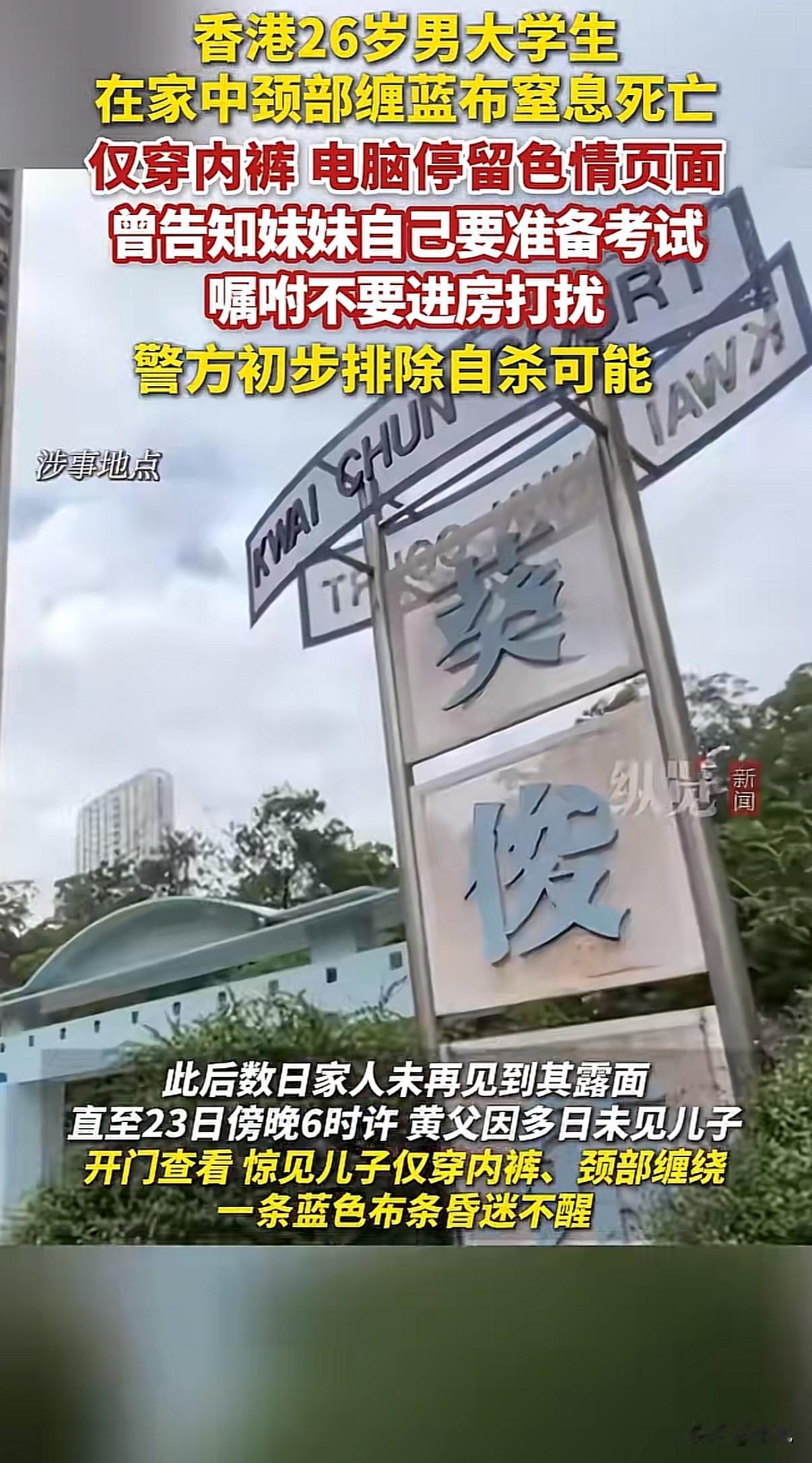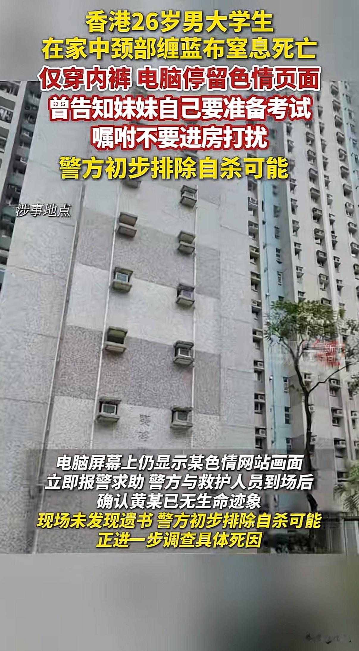 “为求快感把命丢了”!香港一个26岁男大学生,在自家卧室出了意外。当时他脖子上缠着蓝色布条,电脑屏幕亮着,正停留在某个色情网站。人就那么没了。 10月21日晚上,他还跟妹妹说准备考试,别打扰他。两天后,父亲感觉不对劲,推开门才发现儿子已经不省人事。救护人员到场确认死亡,连抢救的机会都没有。 警方调查后说这不是自杀。现场没有遗书,没有打斗痕迹。这种追求特殊快感的行为,医学上叫“性窒息”。通过暂时缺氧来增强兴奋感,风险极高。 这个大学生平时和家人同住,谁也想不到会发生这种事。他特意嘱咐家人别打扰,结果意外发生时连呼救的机会都没有。 查看资料,类似案例不少。2018年美国有研究显示,性窒息的死亡案例中,超过90%都是独自一人。这种行为一旦失控,几秒钟就能致命。 香港大学生压力大是公认的。有调查显示超过三成学生存在焦虑症状。压力之下,有人会寻求极端释放方式,却不知道这是在玩火。 生命太脆弱了。年轻人更应该学会健康减压,运动、交流、专业咨询,哪个都比危险行为强。家长也要多留意孩子的异常举动,早发现早干预。 希望这样的悲剧别再重演。