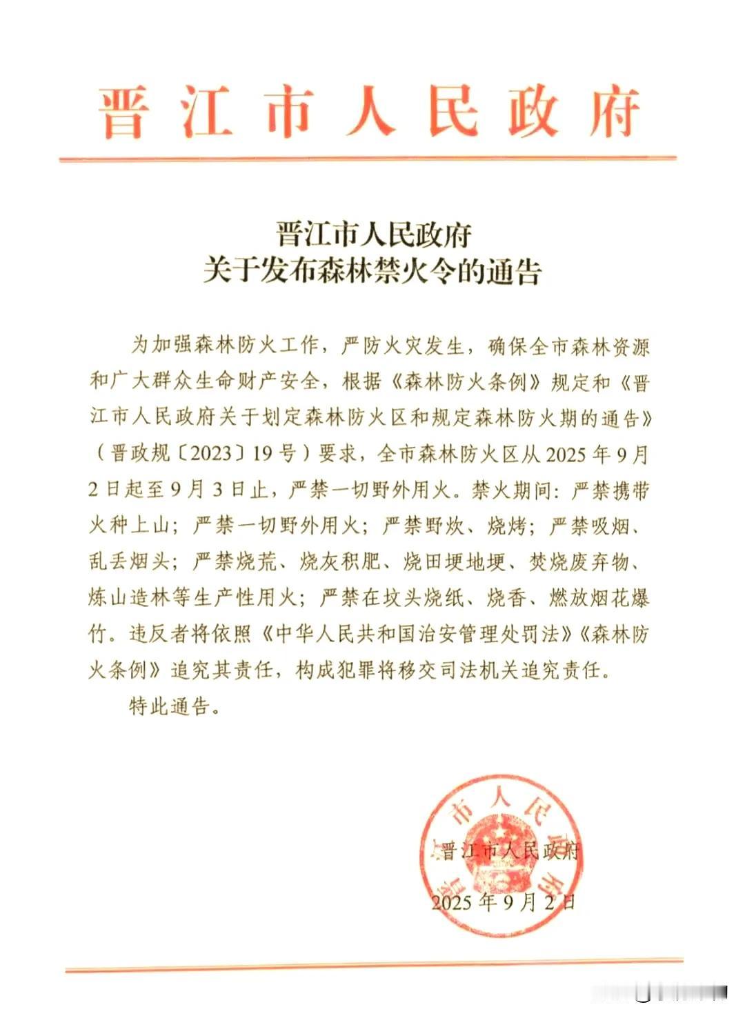 晋江人注意!左边安全右边罚款,明起6天全市禁火! 2025年禁火令?穿越时空还是手滑打错?晋江全域森林严禁野外用火,违者可能面临法律制裁!防火不是小事,但政策细节却让人有点迷糊,希望我们都能共同守护这片绿色家园🌳 这波操作让不少网友调侃:“难道未来战士来晋江了?”防火区内一切野外用火都被严格禁止,一不小心可能就得去“喝茶”,但具体执行方式却让人有点摸不着头脑。 想象这样一个场景:10月19日到24日期间,你刚把烧烤架支起来,结果工作人员就来了,野炊计划直接泡汤。抽烟、烧香、放鞭炮这些平时看似普通的行为,现在全成了重点排查对象。晋江这次可是动了真格,毕竟保护森林就是在保护我们自己的生活环境。 不过这个2025年是怎么回事?是官方提前剧透还是单纯打错字?目前还没有得到详细说明,执法渠道也不太明确,让大家在执行时有些困惑。防火确实要从日常做起,比如出门前记得检查是否带了火种,千万别让小火星酿成大祸。 你们觉得这条禁令是打错字了还是神预测?欢迎在评论区分享你的看法,一起来说说怎么更好地防火护林吧!🌲