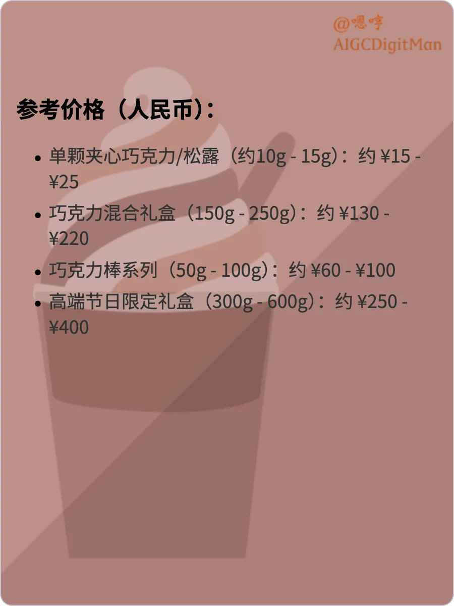 单颗夹心巧克力/松露(约10g - 15g):约 ¥15 - ¥25