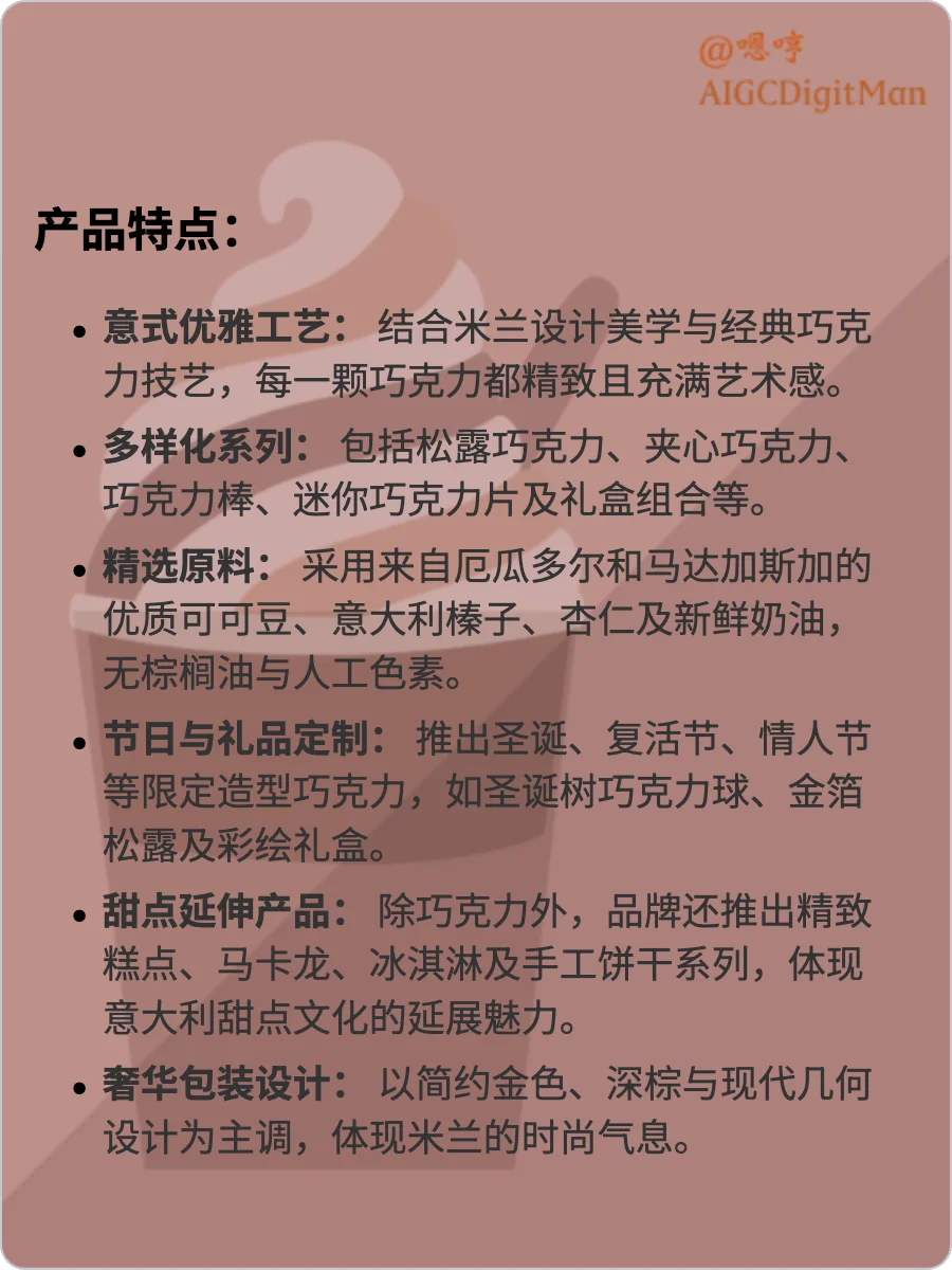 品牌总部位于米兰,以“传统工艺与当代设计的融合”著称,致力于打造高端巧克力与甜点艺术品。