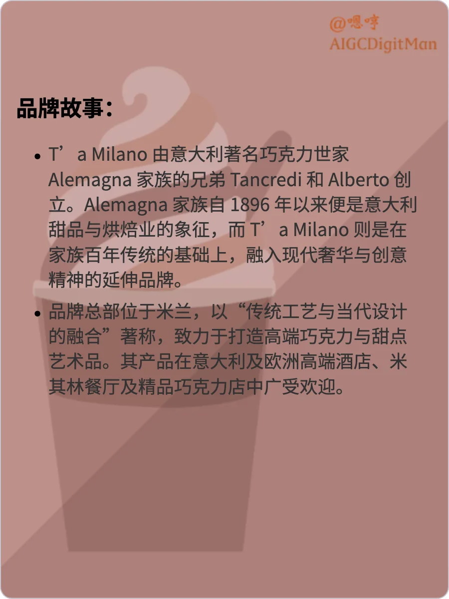 Alemagna 家族自 1896 年以来便是意大利甜品与烘焙业的象征,而 T’a Milano 则是在家族百年传统的基础上,融入现代奢华与创意精神的延伸品牌。