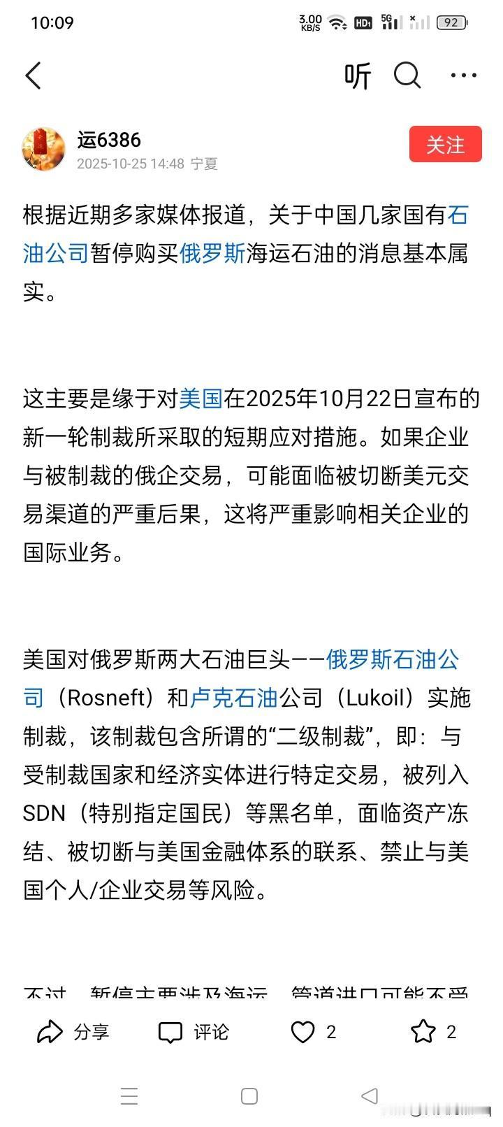 搅散了“战斧”,也将自己带进去了? 10月17日的那通电话,威力巨大,至今余音未消。 据网络上的消息说,美国制裁俄罗斯的两家最大、最主要的俄罗斯石油公司和卢克石油公司后,正在考虑进一步对俄罗斯的金融领域、能源运输行业实施制裁。 对俄罗斯最主要的两家石油公司的制裁,实际上不仅仅是这两家石油,而且似乎还包括这两家公司的几十个、甚至是上百个的子公司和企业,以及购买这两家石油公司原油的所有的外国公司、工厂、企业。 有消息说,东方某大国的国有石油公司开始准备停止、或停止购买俄罗斯两家最大石油公司石油的消息,基本上是真实可靠。 真的是应了那句:鱼与熊掌不可兼得。