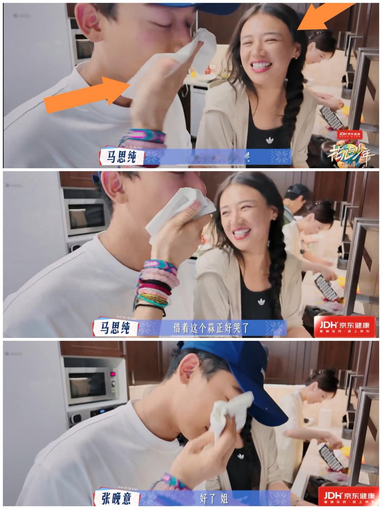 龚俊,张晚意都多亏了那英, 马思纯只能在旁边干瞪眼, 那英直接上手。 张晚意,龚俊他们在准备四川火锅, 张晚意负责剥大蒜, 辣得眼泪和鼻涕都快掉下来了。 马思纯只敢在旁边吐槽他“借着这个蒜正好哭”, 而那英直接拿纸巾帮张晚意擦鼻涕和眼泪。 笑称“保护大蒜” 不然被他的鼻涕污染了。 这个情况怎么那么熟悉, 对了, 上次龚俊喝咖啡差点滴到衣服上, 两只手都拿着东西,没有空手, 也是那英直接上手“解除危机”。 这次张晚意鼻涕眼泪差点滴到大蒜上, 也是那英出手。 更加神奇的是, 这两次“危机”发生的时候, 马思纯都在张晚意,龚俊身边, 她没有任何行动, 她没有动手, 她只能“动嘴”, 只能吐槽。 她可不能像那英 那样直接拿纸巾帮他们擦。 她不能那样做, 不然第二天这个将是热搜第一。 那英这样做, 多半会被解读为对弟弟的关爱。 而马思纯如果那样做, 网友的解读就会相当精彩啰。 是呀, 那英想看捷克雕塑,龚俊主动陪着, 那英恐高不参加极限运动,张晚意主动陪着。 他们对于那英的好, 那英记在心里, 也把他们当“家人”一样爱护, 及时提供帮助。 做得那么得心应手, 那么大方自然。