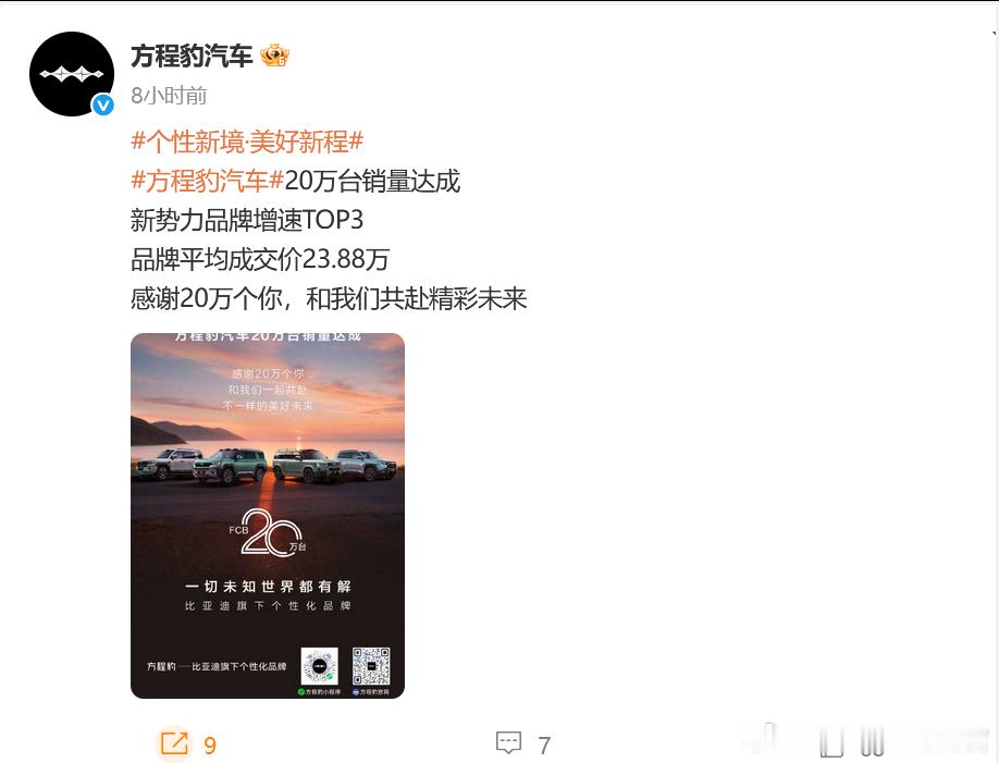 方程豹的平均成交价:23.88万,在新势力品牌中肯定是名列前茅了[并不简单]