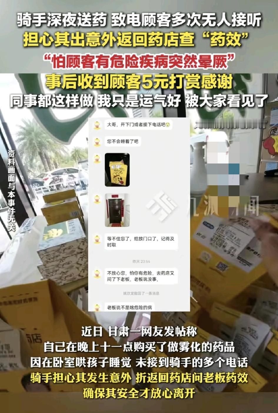 甘肃一位外卖骑手接到顾客买药的订单,但是多次致电顾客没人接听,担心顾客出现意外返回药店,查询药品信息确认对方是安全的才离开,不过订单已超时,顾客了解实情后给了5元的感谢费用,平台也给予骑手颁发了奖金和相关的荣誉证书,骑手表示,平时很多同事都这样做,自己只是运气好被大家看见而已。平凡人能够相互鼓励,相互照应,就是人间最温暖的写照。