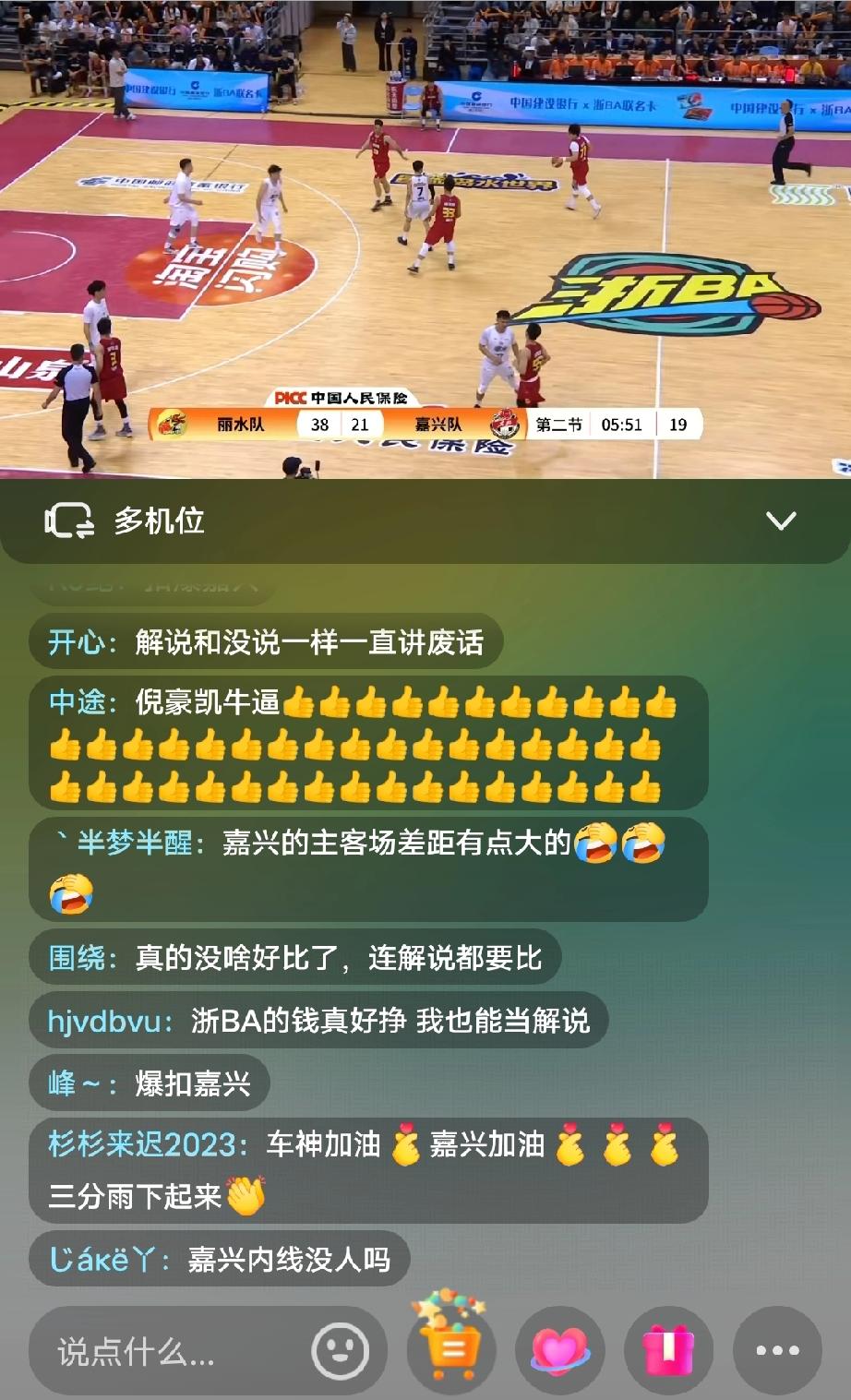 嘉兴队第二节上来直接让丽水队的一波得分给干懵了。分差已经差不多到20分了,嘉兴队要想翻盘好像已经不太可能了! 一个多月之前,嘉兴在自己的主场赢下本组强队苍南后,直接让嘉兴球迷的信心爆棚,那个时候,凡是浙ba的比赛,评论区少不了嘉兴球迷趾高气扬、目中无人,嘉兴和苍南球迷在评论区互怼更是家常便饭。可随后嘉兴连续吃了几场败仗,现在嘉兴球迷的心气也没有了。今天两节比赛时间还没到,嘉兴队输球却已经定局,嘉兴球迷一点声音都没有了! [我想静静][我想静静][我想静静] 说个题外话,丽水主教练咋回事,比分领先这么多,干嘛还跟场上裁判发生争执啊?