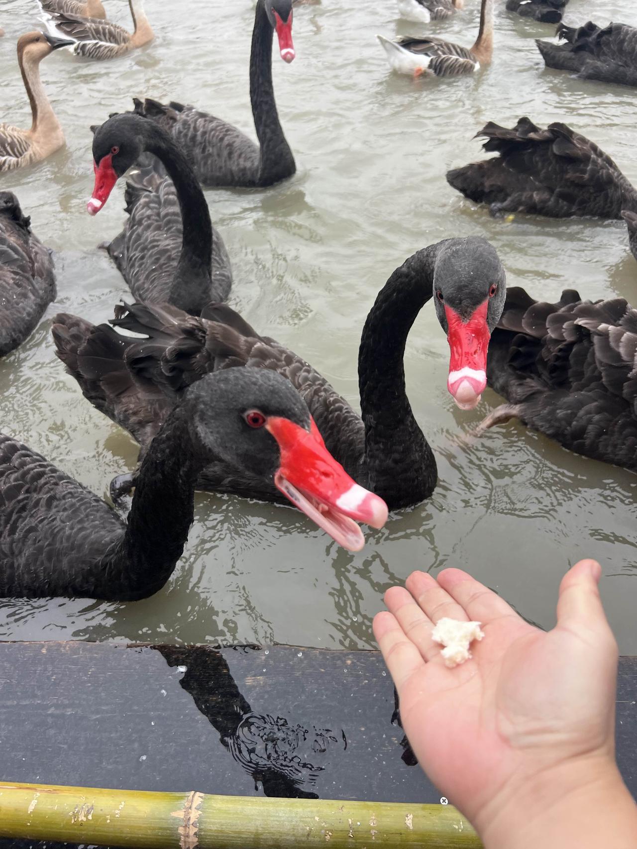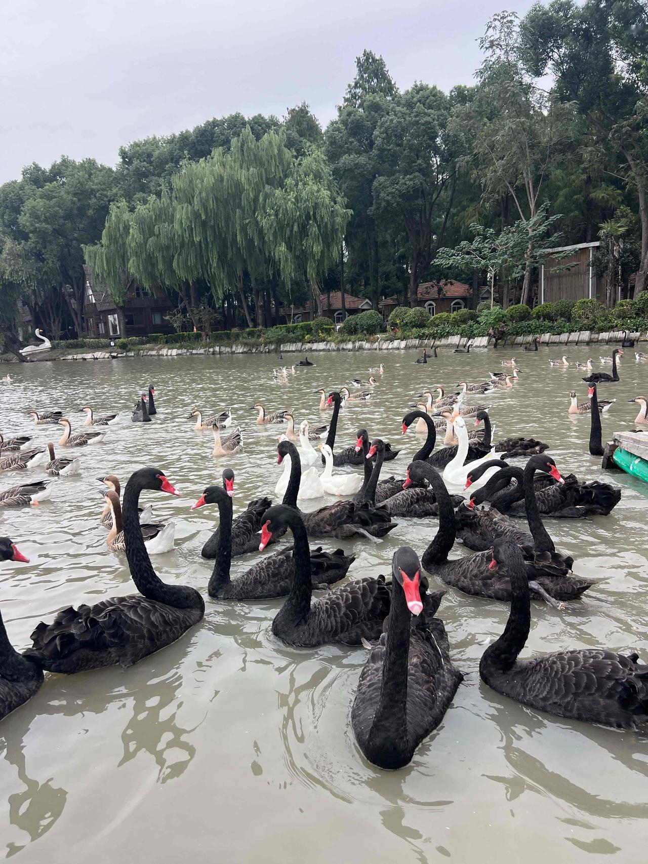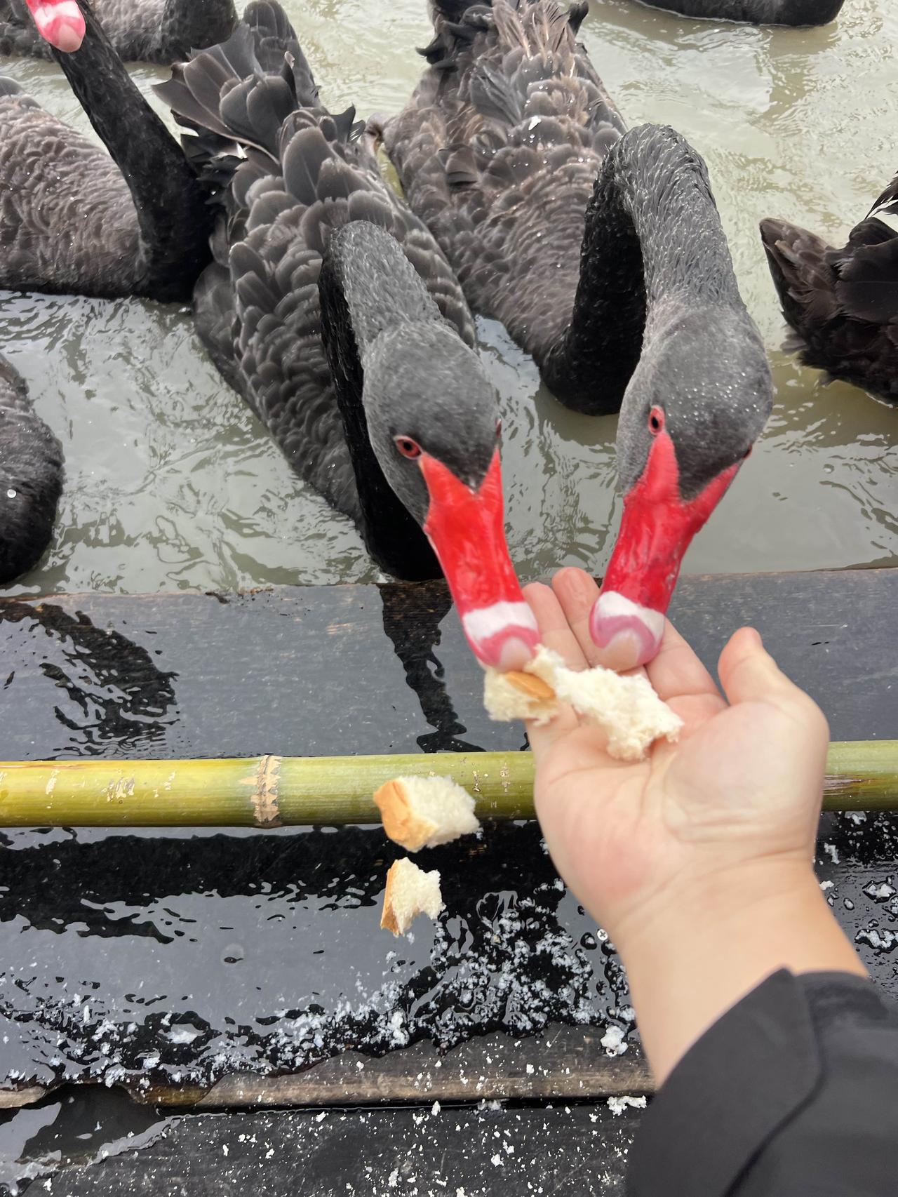 天鹅公园 来青浦的大千天鹅湖庄园玩,从市区开车过来差不多要一个小时,还是有点距离的。也可能是因为距离原因,这个成立于1997年的庄园,之前居然一点都不知道。 既然叫天鹅庄园,主要就是以天鹅为卖点,园区内培育有上千只黑天鹅,有不少游廊和水边都可以喂,不过去坐竹排来喂天鹅更好玩一些,会有大群的黑天鹅、大雁和白鹅追着跟着,买票上船的游客会给一个白馒头来投喂,当然自己也可以提前多带点吃的,馒头白菜都可以。 把掰碎的馒头扔到湖里,成群的黑天鹅、大雁围着追逐,当然天鹅更有优势,因为它的脖子更长。如果胆大些,甚至可以放在手心让天鹅来啄食,就算啄到手也并不疼,毕竟没有牙齿,而且天鹅其实是食素的,小鱼都不吃。 跟想象的不同,以为珍贵的黑天鹅是饲养的,从小剪了羽毛,不但飞不了甚至是可以来吃的。而大雁反而是贵客,因为是国家二级保护动物,所有的大雁都是不能碰的,所以大雁都是可以飞的,来去自由。 不过听船工讲,这些大雁已经习惯在这里,享受一天两顿,不用四处奔波之苦的铁饭碗待遇,不再东南飞了。