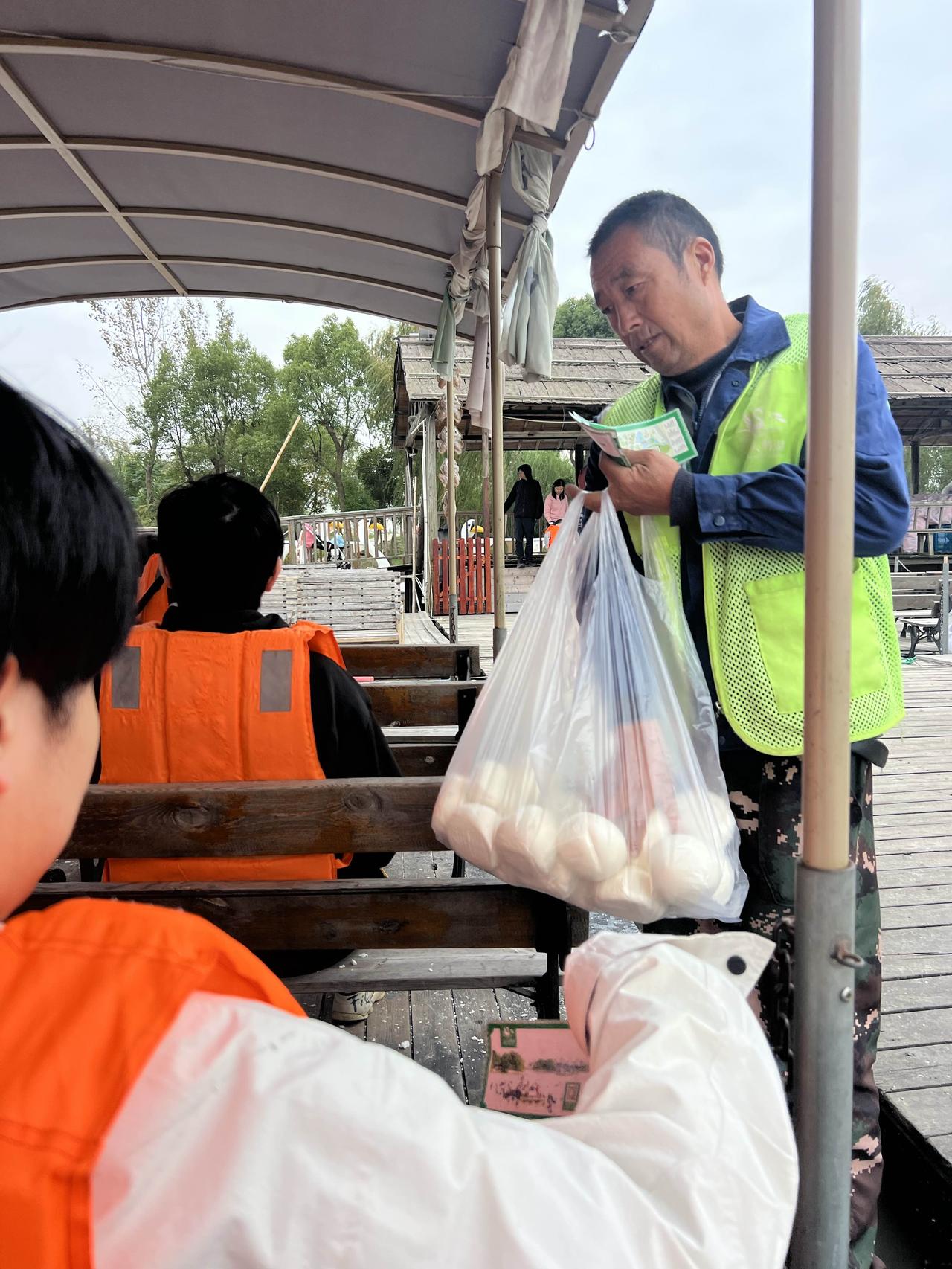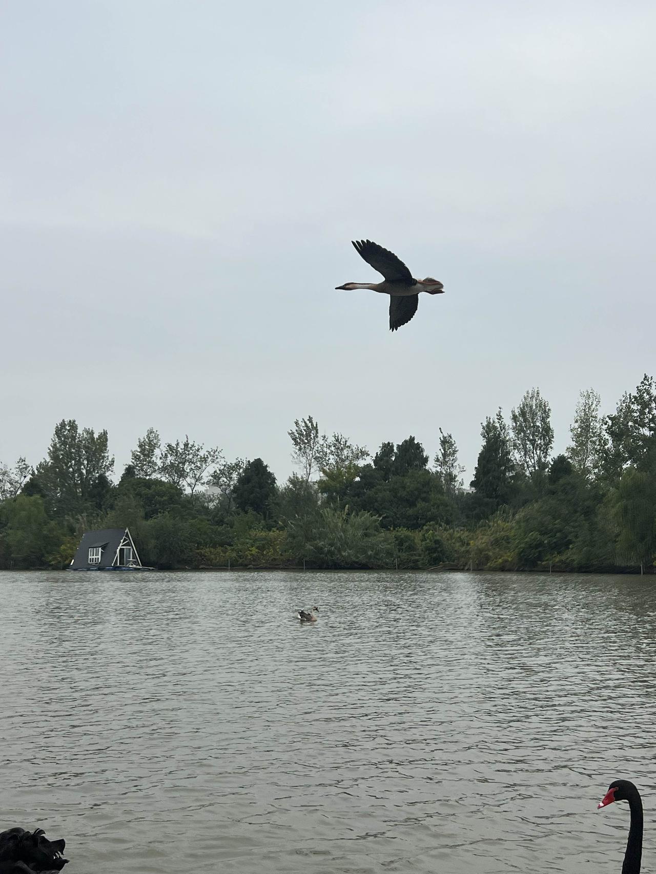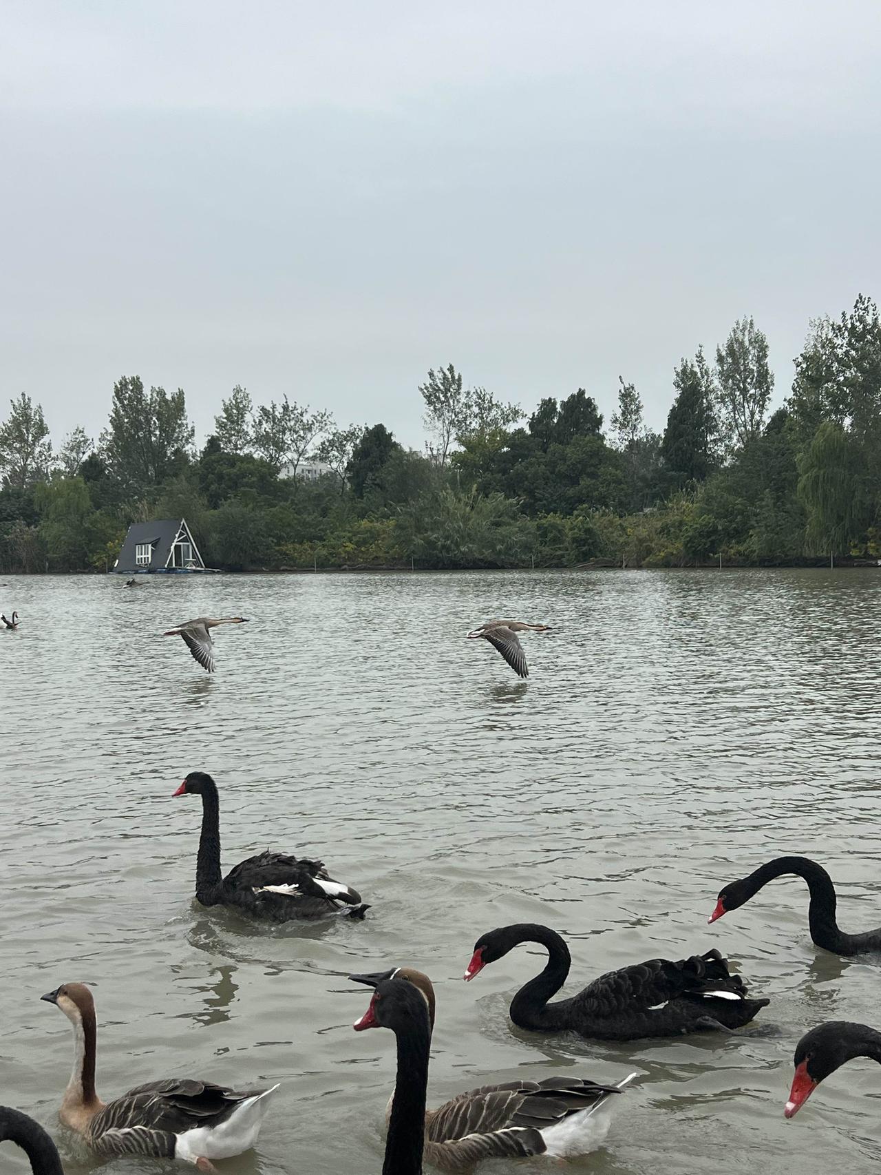 天鹅公园 来青浦的大千天鹅湖庄园玩,从市区开车过来差不多要一个小时,还是有点距离的。也可能是因为距离原因,这个成立于1997年的庄园,之前居然一点都不知道。 既然叫天鹅庄园,主要就是以天鹅为卖点,园区内培育有上千只黑天鹅,有不少游廊和水边都可以喂,不过去坐竹排来喂天鹅更好玩一些,会有大群的黑天鹅、大雁和白鹅追着跟着,买票上船的游客会给一个白馒头来投喂,当然自己也可以提前多带点吃的,馒头白菜都可以。 把掰碎的馒头扔到湖里,成群的黑天鹅、大雁围着追逐,当然天鹅更有优势,因为它的脖子更长。如果胆大些,甚至可以放在手心让天鹅来啄食,就算啄到手也并不疼,毕竟没有牙齿,而且天鹅其实是食素的,小鱼都不吃。 跟想象的不同,以为珍贵的黑天鹅是饲养的,从小剪了羽毛,不但飞不了甚至是可以来吃的。而大雁反而是贵客,因为是国家二级保护动物,所有的大雁都是不能碰的,所以大雁都是可以飞的,来去自由。 不过听船工讲,这些大雁已经习惯在这里,享受一天两顿,不用四处奔波之苦的铁饭碗待遇,不再东南飞了。
