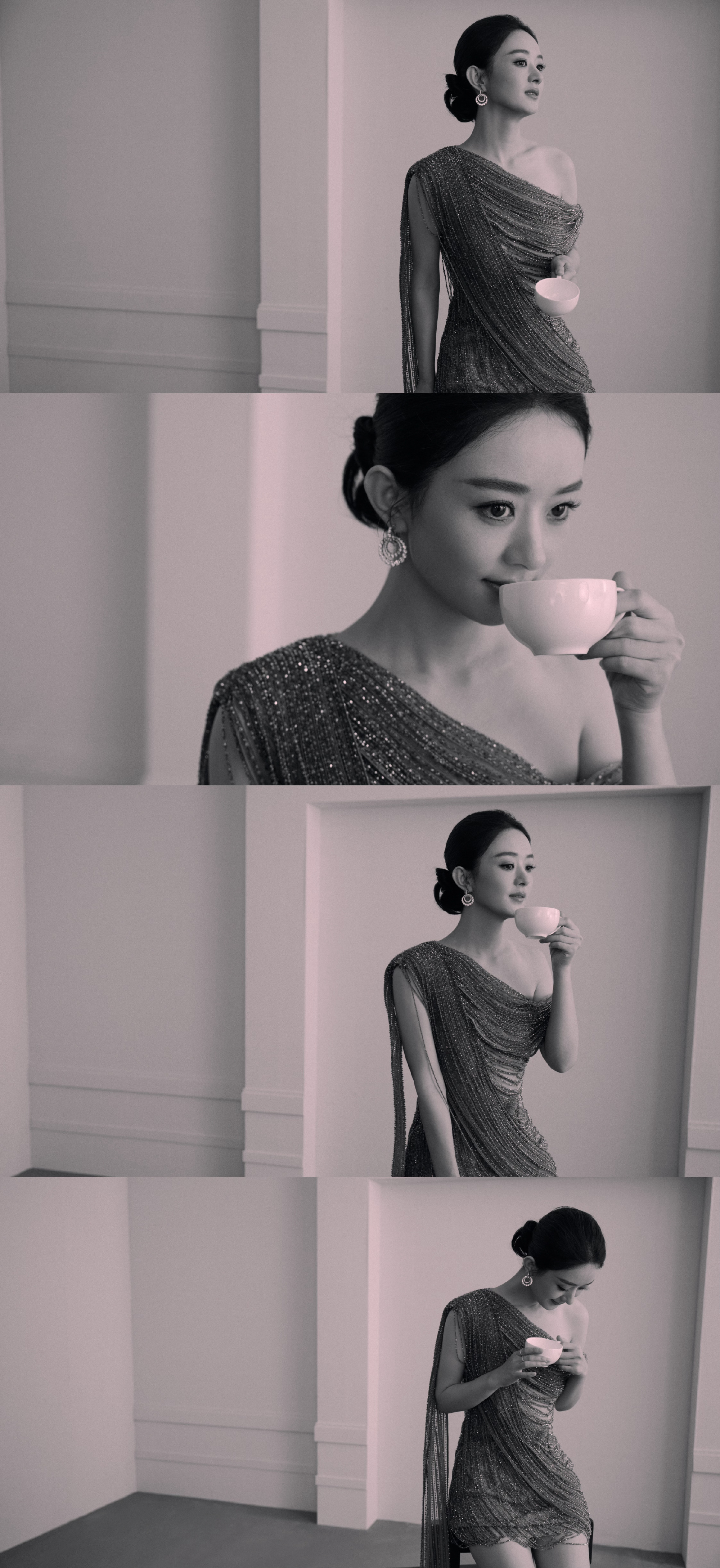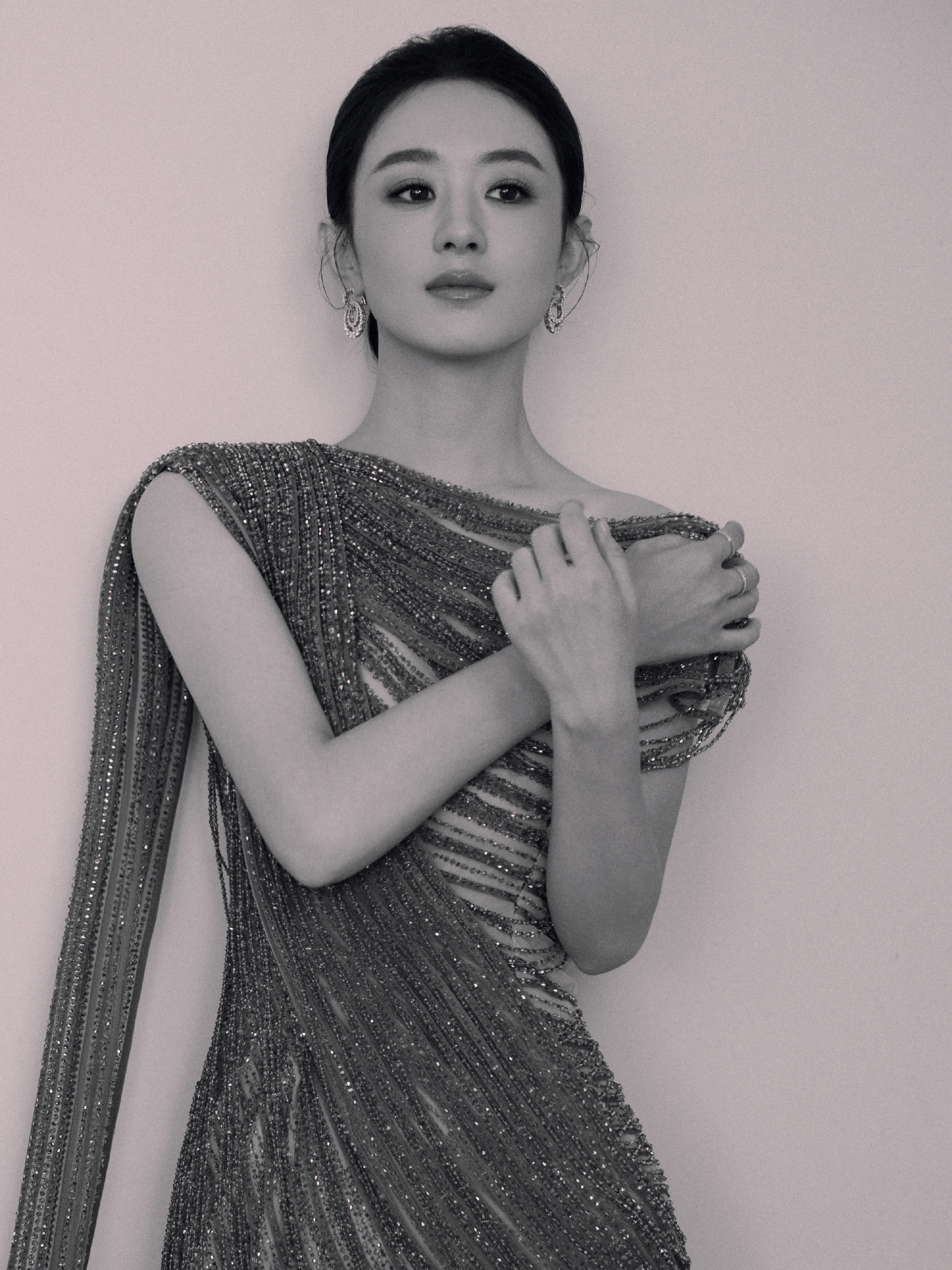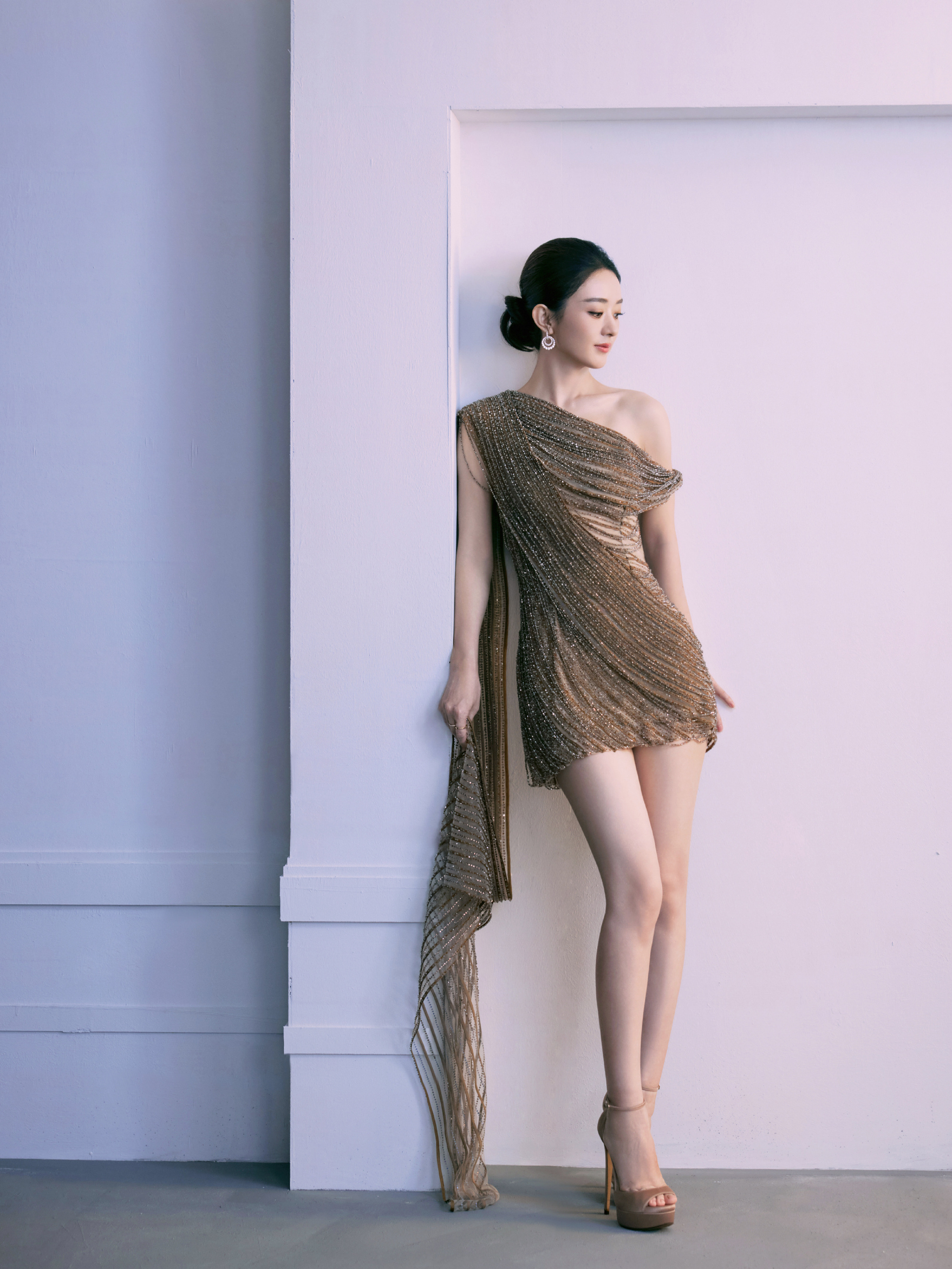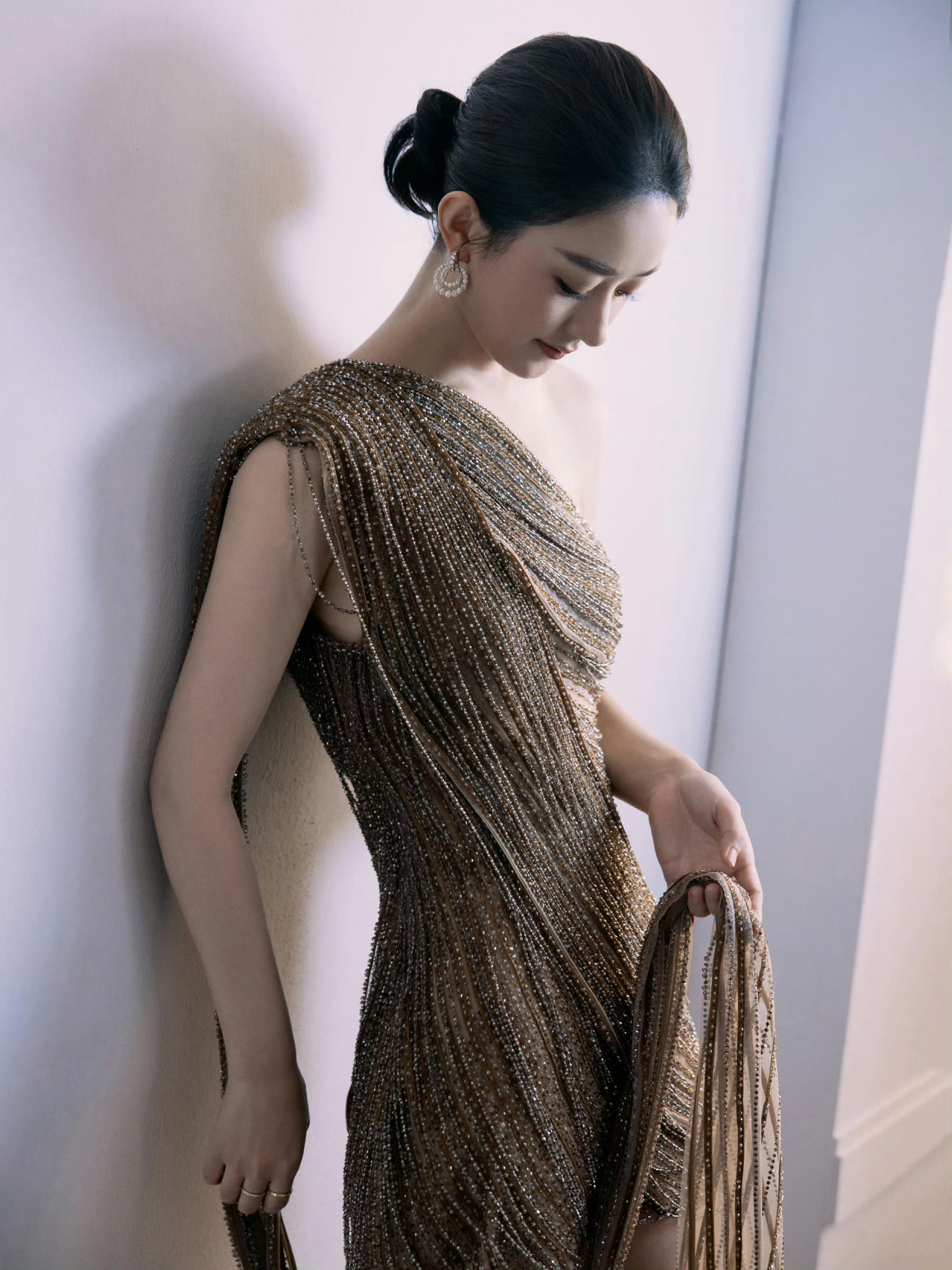 赵丽颖身着Cong Tri 2026春夏系列斜肩鎏金礼服亮相科兰黎品牌直播