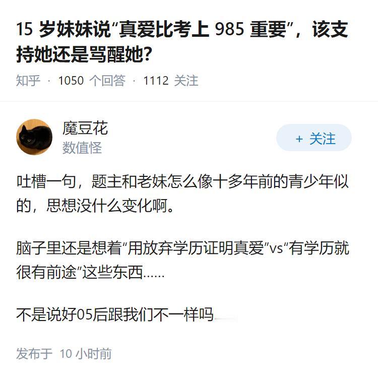 15 岁妹妹说“真爱比考上 985 重要”,该支持她还是骂醒她?