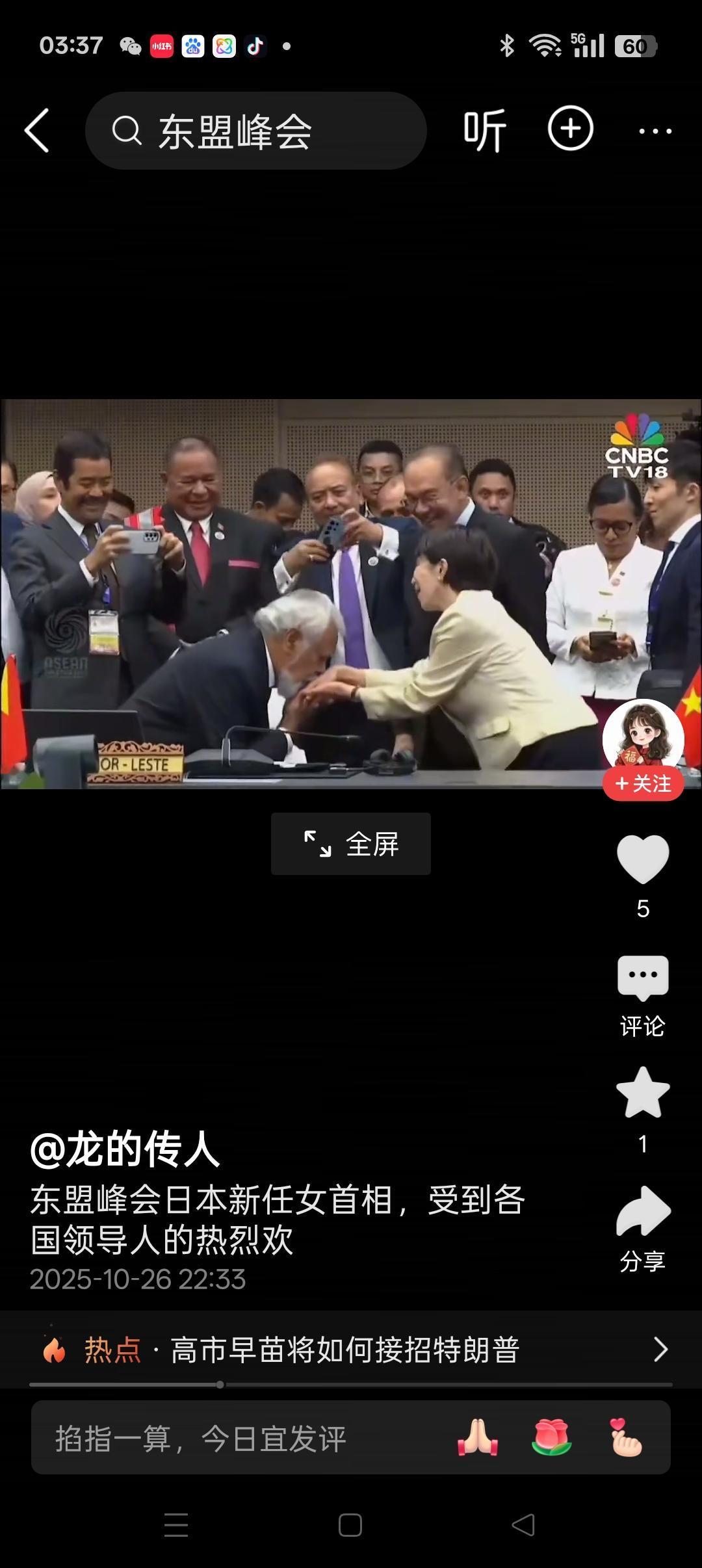东盟峰会高市早苗还真出尽了风头! 日本新仼首相高市早苗在这一次东盟峰会上还真出尽了风头:与会领导人照相她位居C位;会间她受到了各国领导人的热烈欢迎,东帝汶总理甚至给予其最高礼仪的吻手礼;会上主持人马来西亚总理还邀请她作了开幕主旨发言;会后其当晚返程回国也受到较高礼遇的欢送。 这是高市早苗就职后的首次外事活动,之所以受到欢迎,与她的女性身份有一定关系,但是,从她在峰会上的言行举止上看,她还真是个“狠”角色!远远比石破茂厉害的多,需要引起我们的高度警惕。