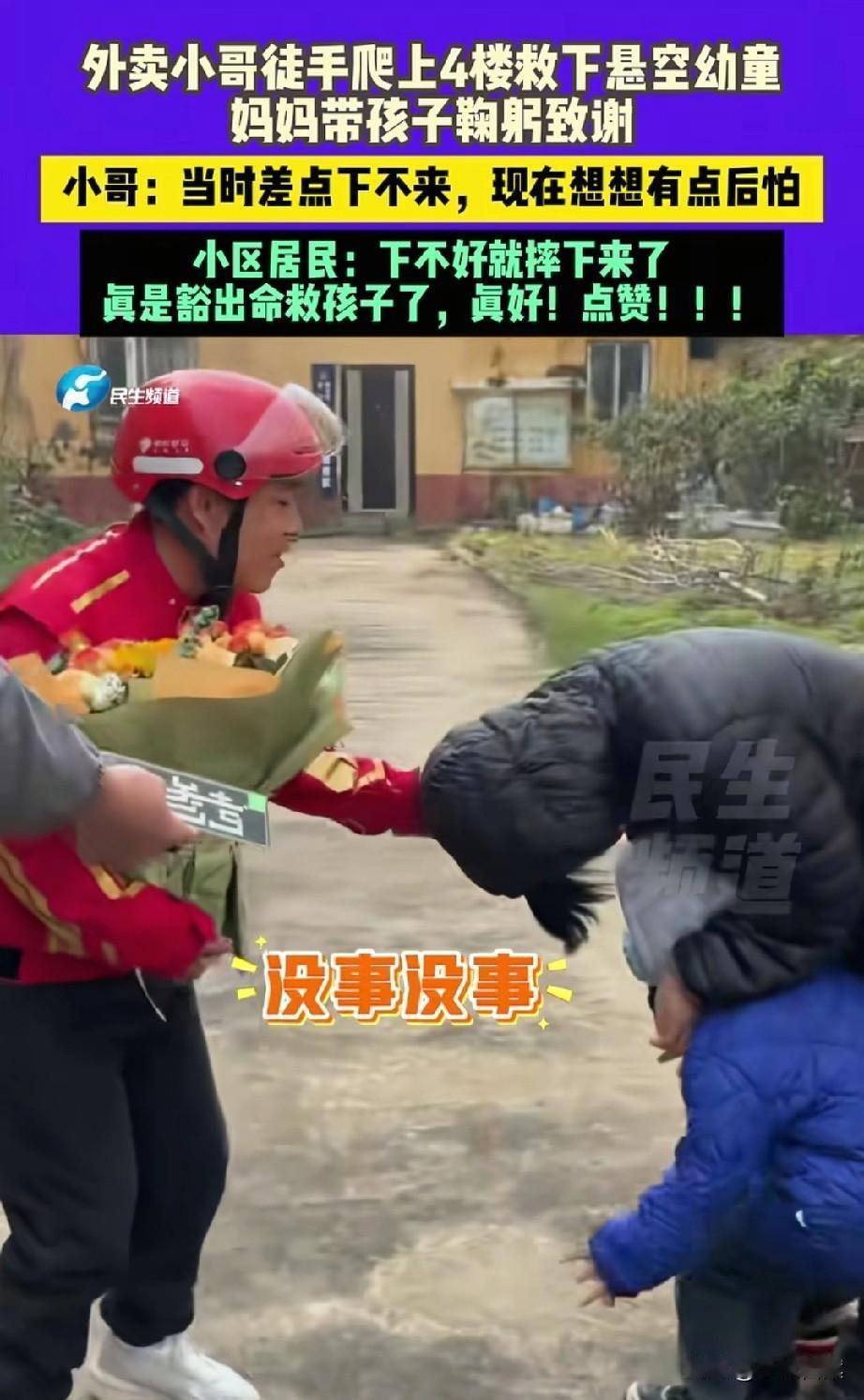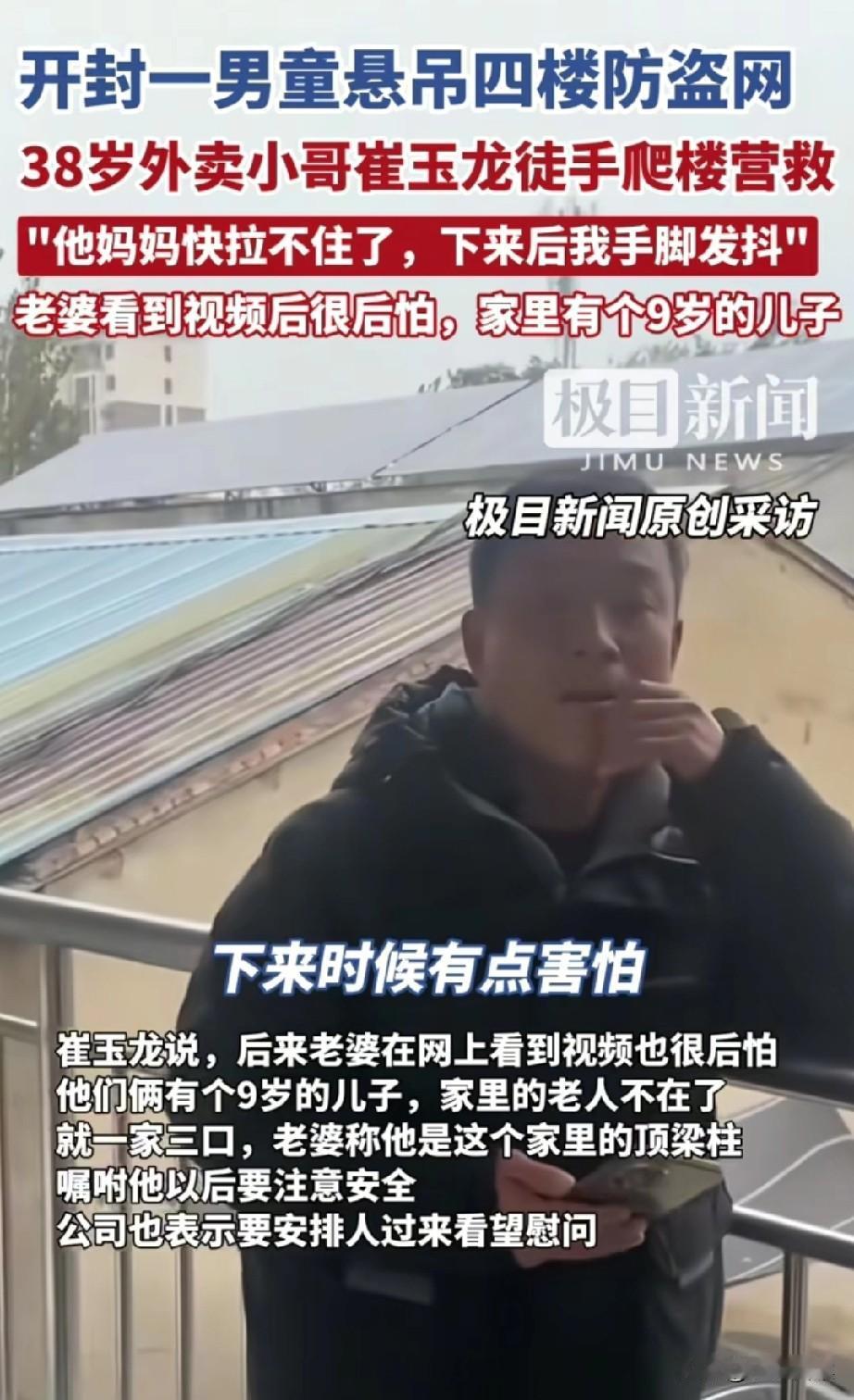 勇救4楼被卡小孩的外卖员名叫崔玉龙,他今年38岁,有一个9岁儿子,是家里顶梁柱。妻子看完视频后非常后怕,了解整个营救过程,才知道一切有多么的危险! 10月25日中午,河南开封一老小区内,送完餐后的崔玉龙准备离开,却发现一栋楼下人头攒动,还有人拉起了床单。 顺着人群的目光往上看,只见4楼窗户的防盗网上,一名小孩卡在那里,大半个身子吊在外面,只剩脑袋还在网内。 小孩母亲死命抓住儿子衣服,整个上半身衣物已被拉成一团,一旦母亲体力不支,小孩被卡住窒息或者直接掉下楼来,后果都不堪设想。 就在这千钧一发之际,崔玉龙想都没想,直接脱掉工作服和头盔,从一楼户外,借助管道和每户人家的防盗网徒手攀爬,最终站在3楼防盗网顶部,与小孩母亲一起合力,将人给救了上去。 4层楼,十几米的高度,先要爬上去救人,然后又要自己爬下来,只要稍微失手跌落,或体力不支,受伤是必然的。 下面人群拉的床单,对体重轻的孩子或许有救护作用,但对一个成年人来说,与纸糊的无异,可以说是一点保护措施都没有。 另外,从楼体外墙看,风化水渍遍布,防盗网和管道都是黢黑一片、锈迹斑斑,看样子已经有些年头了。一百多斤的人拉扯踩踏,万一脱落或断裂,崔玉龙同样会发生危险。 这真的是拿命在营救!当时的他顾不得考虑那么多,只想早一秒让孩子平安。一方面是源自内心原本的良善,另一方面,大概是崔玉龙自己家里也有9岁的儿子,为人父的他更能够对保护子女感同身受。 在自身平安落地的那一刻,崔玉龙手抖不止,整个人瘫软了,这是人本能的后怕,疼爱丈夫的妻子看完视频后也有此反应。 值得一提的是,事后,小孩母亲带着孩子给崔玉龙送花并鞠躬感谢,崔玉龙的儿子也竖起大拇指,骄傲地夸赞父亲。 虽说施恩不图报,但来自被救者的感谢,能让救人者心生温暖,以后能够更加砥砺前行。双方家长的正确态度和榜样作用,也能让下一代树立良好观念,让其能够明辨是非。 三岁不离手,七岁不离眼!生活中一些危险很难被察觉和规避,各位家长在带小孩时,千万不能掉以轻心…… 【关注@小讼言案 ,为您分享更多精彩】 (来源:央视新闻)