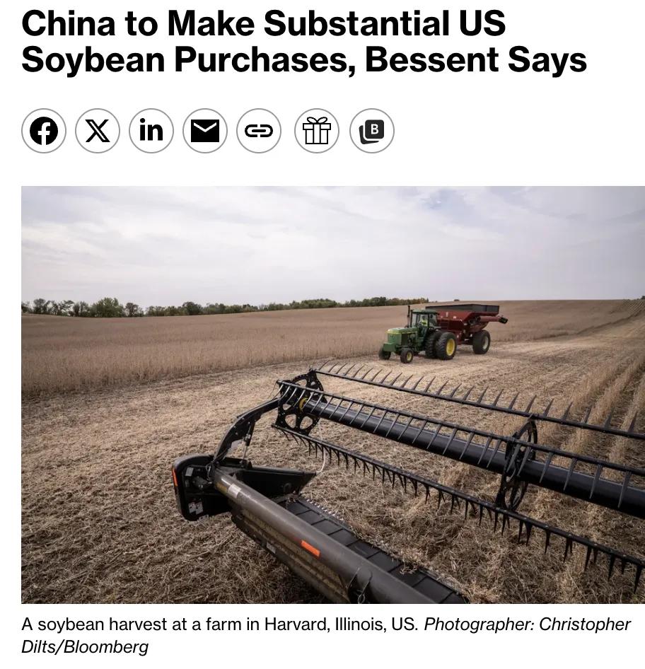 美国icon财政部长斯科特·贝森特(Scott Bessent)表示,中国将大量采购美国大豆。此举显示,中美在马来西亚icon吉隆坡icon会晤后,两国关系正在改善。 评论: 重要的不是中国采购美国大豆,而是中国采购以后能从美国得到什么呢,不可能是中国单方面妥协。 贝森特周日接受美国ABC主持人采访时表示,双方进行了良好沟通,并将每季度进行会谈。美国暂不征收100%关税,中国同意进口美国农产品,中方在芬太尼问题上开展行动。中方决定将稀土管制措施延后一年执行,期间将会对此进行审查。 “美方表达立场是强硬的,中方维护利益是坚定的。”面对百年未见极端复杂国际变局,大国相处需要有大国智慧,审时度势的变通、互利双方的交易、因势利导的谋划,是大国智慧和相处之道!期待! 中美贸易和谈成功后,最利好是普通人,我们对美出口绝大部分都是制造业,需要大量工人,更多人有了工作,对精英阶层,经济咋样都不会影响他们。 一代人有一代人的上甘岭,先辈未曾低下头,我辈岂能弯下腰!坚决支持国家的一切决定,中国共产党万岁!为中国喝采!!! 还是乐于看到中美两国关系趋于缓和、相互友善,有利于世界和平、人类发展进步