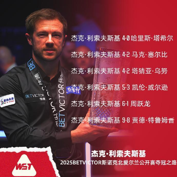 斯诺克:2025北爱尔兰公开赛利索夫斯基夺生涯首冠 北京时间10月26日至次日凌晨,2025北爱尔兰公开赛决赛利索夫斯基以9-8险胜特鲁姆普,第7次排名赛决赛终于圆梦生涯首冠!夺冠后他扑到特鲁姆普怀里,两人久久相拥,泪洒赛场! 决赛上半场,两人的表现都只能说不够理想。 第8局特鲁姆普手握48分,没能打进略有难度的长台袋口红球,利索夫斯基单杆63分清台回敬一局逆转,上半场4-4战平小特! 决赛下半场,两人你来我往,利索夫斯基先到赛点,并最终以9-8决胜局险胜特鲁姆普,终于圆梦职业生涯首冠!本次冠军使得利索夫斯基排名上升至24位。 利索夫斯基职业生涯7次决赛盘点: 2018里加大师赛,利索夫斯基 2-5 罗伯逊 2019中国公开赛,利索夫斯基 4-11 罗伯逊 2019苏格兰公开赛,利索夫斯基 6-9 塞尔比 2020世界大奖赛,利索夫斯基 7-10 特鲁姆普 2021德国大师赛,利索夫斯基 2-9 特鲁姆普 2021直布罗陀公开赛,利索夫斯基 0-4 特鲁姆普 2025北爱尔兰公开赛,利索夫斯基 9-8 特鲁姆普