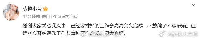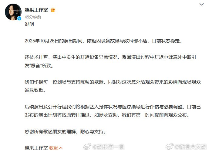 陈粒工作室致歉陈粒 不放鸽子不添麻烦 26日晚,歌手小号发博透露将减少舞台工作。原因是演出中耳机爆炸,让她很痛,她曾说过如果耳机再发生这样的事情,她将“退休”。她强调“观众没有做错任何事情,没有理由要为舞台事故买单。”此外,网友晒出的现场视频中也能明显看到陈粒在演出过程中被吓了一大跳。