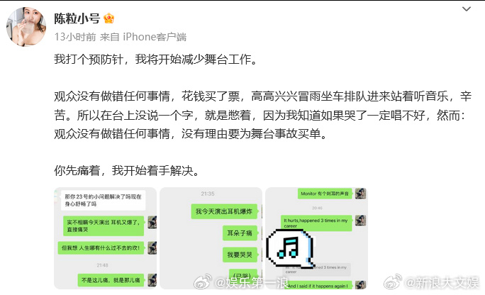 回应陈粒演出时耳机爆炸,称目前状态稳定,设备异常是因耳返电源意外中断引发“爆音”所致。随后,小号再发文,表示已安排好的工作会完成,“不放鸽子不添麻烦,但确实会开始调整工作节奏和工作方式。”