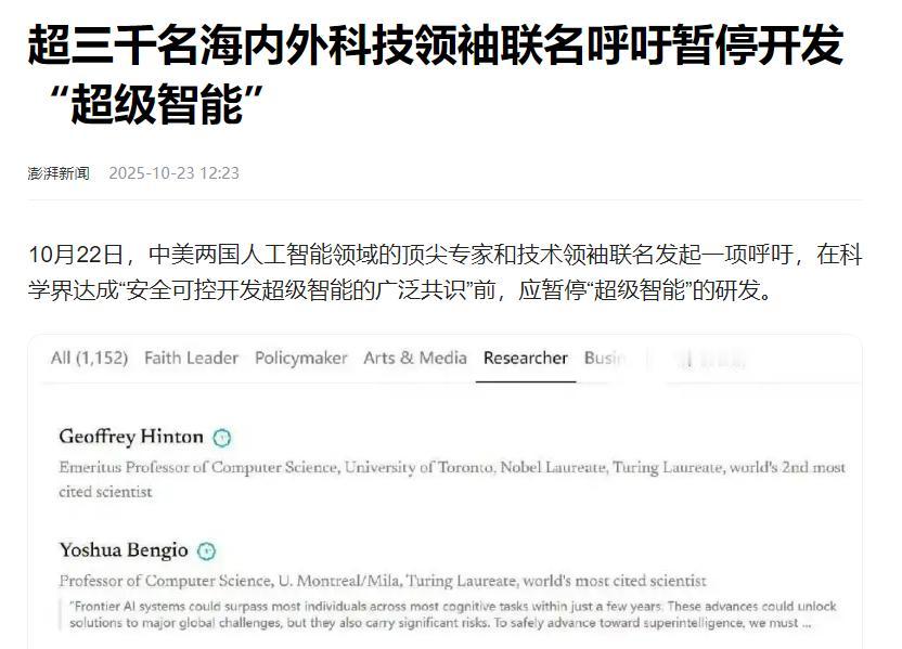 全球超过3000名顶尖科学家和科技大佬突然联名发出紧急呼吁,要求立刻暂停高级人工智能的研发!是真心为人类,还是另有所图? 这件事的由头要从10月22日说起,当天人工智能领域的一批顶尖专家和技术领袖牵头发起了这项呼吁,他们的核心想法很明确:在全世界的科学家们就“安全可控地开发超级智能”达成普遍共识之前,先把“超级智能”的研发工作停一停。 参与联名的人来头可不小,既有深耕AI理论研究几十年的大学教授,也有全球知名科技公司的技术掌舵人,还有专注AI伦理研究的机构学者,他们觉得超级智能要是继续往前发展,可能会出现没法控制的风险,给人类社会带来潜在威胁。 这些专家对超级智能的担忧不是凭空来的,他们提出一旦超级智能突破“技术奇点”,也就是AI的智能水平突然超越人类,进入自主进化的阶段,就可能在自主做决定、能力升级这些方面脱离人类的掌控,到时候说不定会引发伦理争议、安全事故甚至更严重的生存问题。 但话又说回来,现在人工智能的发展还没到那一步,行业里大家基本都认可,AI离所谓的“技术奇点”还远着呢。 目前咱们用的AI技术,更多是在特定领域帮上忙,比如手机上的语音识别、拍照时的图像处理、购物软件的智能推荐,还有智能客服、自动驾驶辅助系统等等,这些都只是“专用AI”。 这些AI技术和那种有自主意识、能超强学习进化的超级智能仍差着相当大的鸿沟,在这个时候突然喊停高级AI研发,难免不让人心里打个问号。 早几年,我国就曾在联合国会议上提出过“禁止机器人、AI的战争化”的倡议,就是想规范AI技术在军事上的使用,别让它变成伤害人类的武器,避免造成人道主义危机。 但当时除了我国积极推动,响应和支持这个倡议的国家没几个,不少西方国家要么沉默以对,要么以“技术发展自由”为由委婉拒绝,导致相关规范迟迟难以推进。 可现在不一样了,中国在人工智能领域一步步稳扎稳打,不管是算法研究、芯片研发,还是行业应用,都在多个细分领域取得了亮眼成果,技术落地和产业发展的速度让全世界都盯着。 偏偏就在这个时候,以美西方为主的这么多科学家和科技大佬站出来呼吁暂停高级AI研发,任谁看了都难免会把这事和国际间的技术竞争联系到一起。 当然,我们也不能一棍子打死,确实有部分科学家是真心为人类安全着想,担心技术失控带来灾难。但要是结合全球科技竞争的大背景来看,这一呼吁背后似乎还藏着别的心思——遏制中国AI技术的发展。 要知道,现在全球科技竞争越来越激烈,人工智能可是核心中的核心领域,谁能在这个领域站稳脚跟、抢占先机,谁就握住了未来发展的主动权。 在这种情况下,通过联名呼吁暂停研发的方式,来减缓竞争对手的发展节奏,这种可能性实在让人没法忽视,也难免让大家对这份呼吁的真实动机产生怀疑。