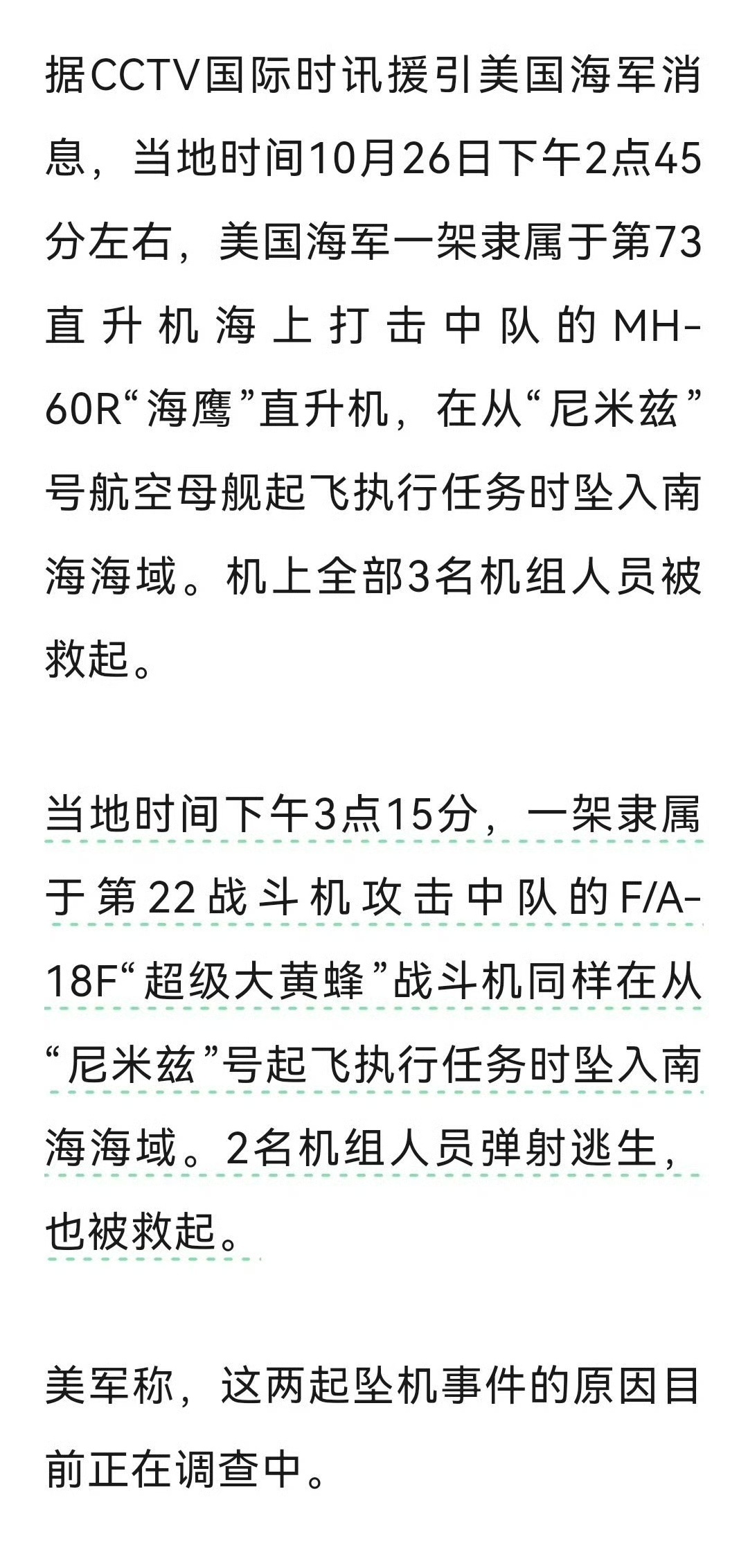 2架美军机在南海相继坠毁厉害啊!美国[哈哈]​​​