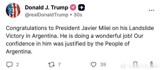 祝贺哈维尔·米莱总统在阿根廷取得压倒性胜利。他做得非常出色!阿根廷人民证明了我们对他的信任是正确的。