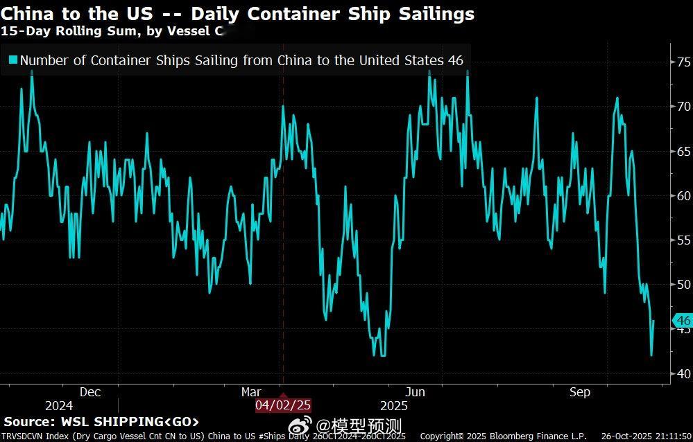 中国至美国的集装箱船班次处于4月2日以来的最低水平。