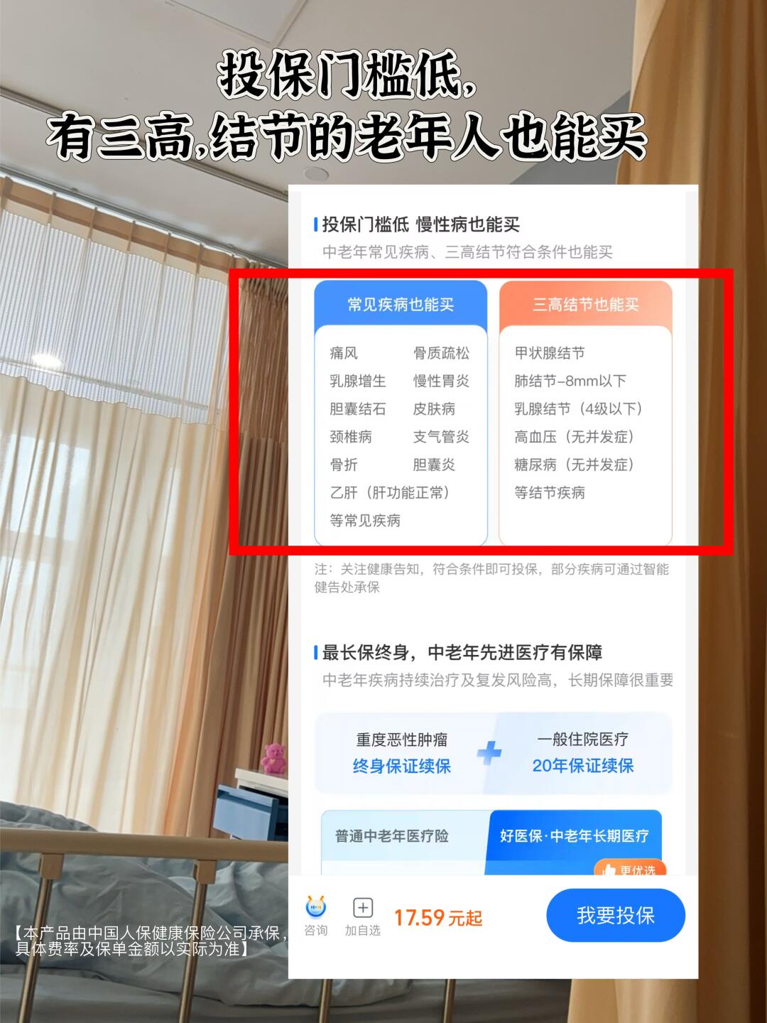我来新西兰之后没多久,就听到国内的好友说他父亲不幸患病住院的事情,我在国外也不由得担心起家里的老人,我妈66岁,有高血压,还有结节,平时在家也不怎么注重身体,当时好友跟我说治疗花了大几十万的医疗费,这还是医保报完的,我震惊了,赶紧我给我妈买了补充医疗险兜底。