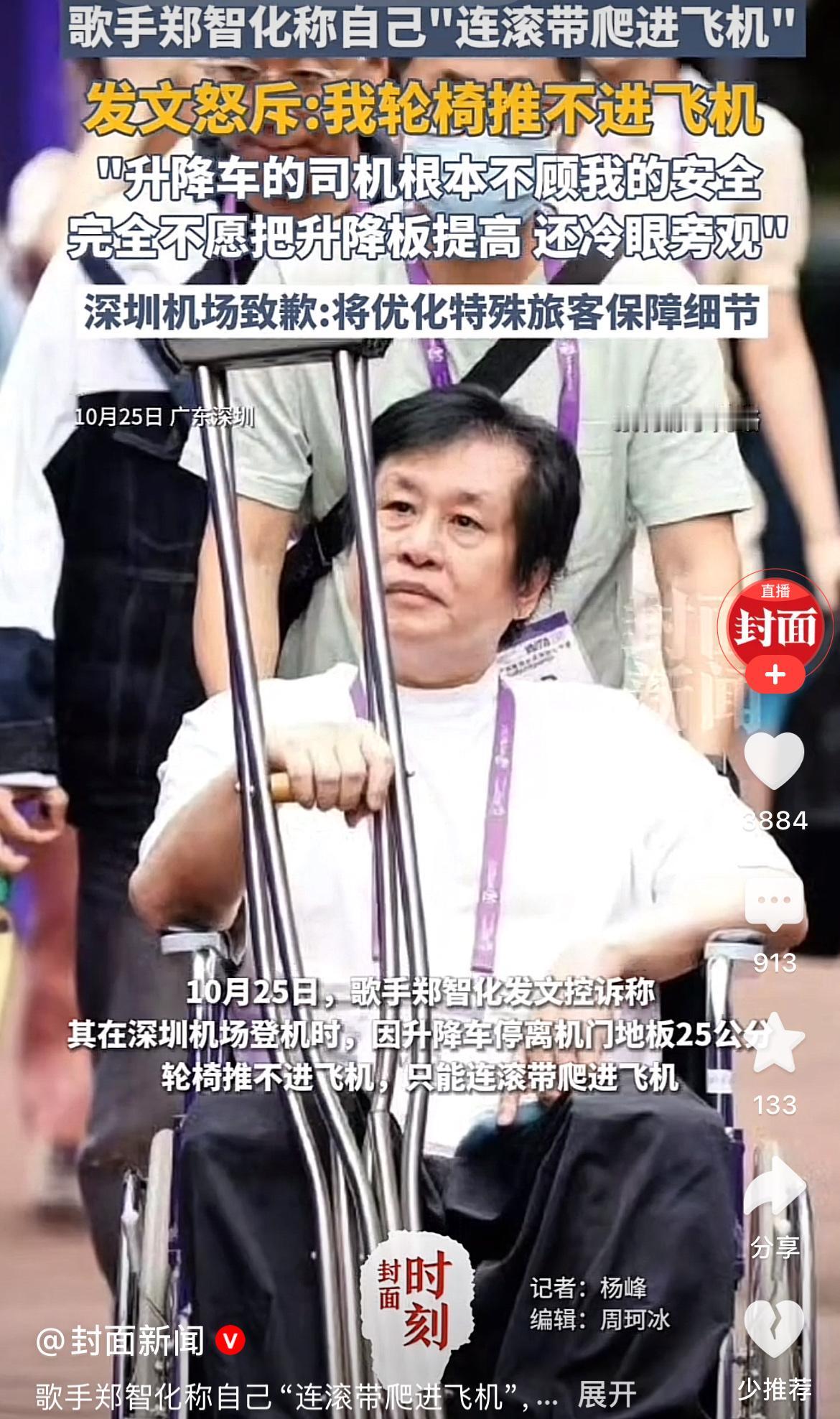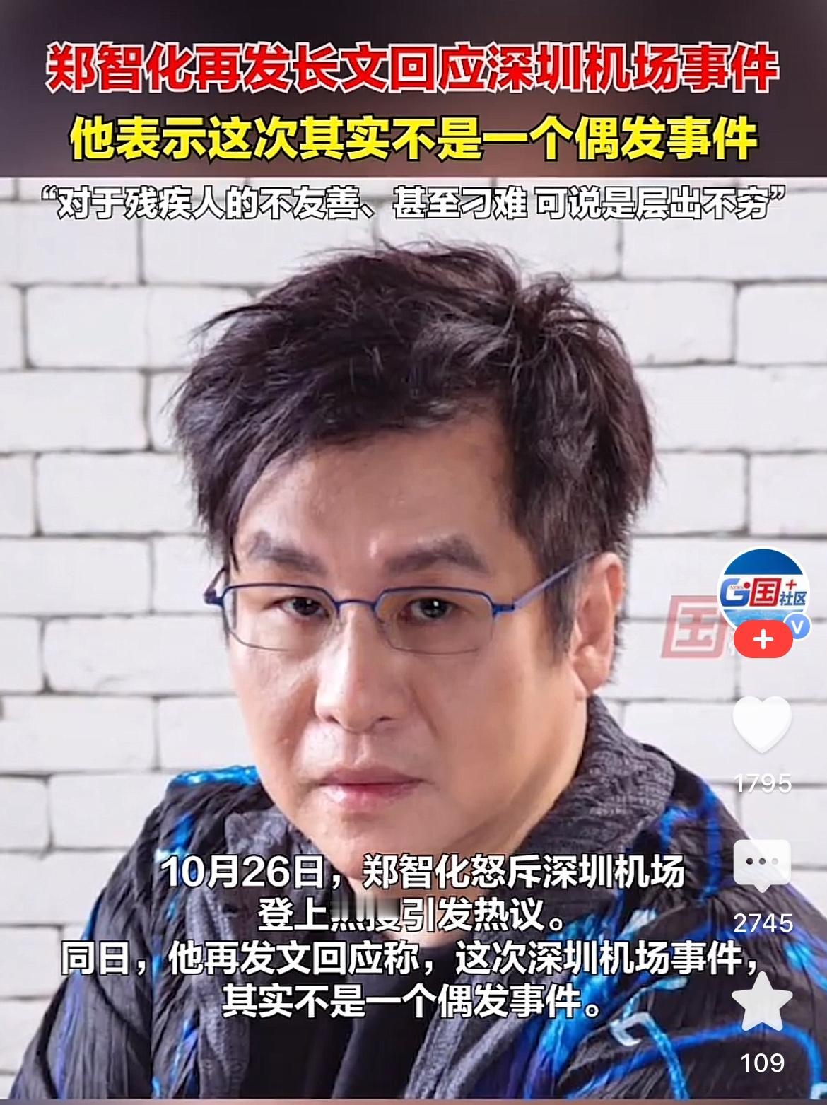 郑智化深圳机场的事情, 一开始我就觉得不对劲, 就算不是明星就算只是一个普通人,如果真的登机困难,深圳机场服务人员也绝对不会坐视不管的。 直到看了监控视频,我才发现了,工作人员做的再多在他眼里也不算什么,他想要做的是自己独立的完成进机舱这个动作。 这要求就有点过分了,机场现有的条件是那样的,工作人员也帮助了,不能说人家冷漠。难不成还要把你抱进去? 所以有时候事情不能只听片面的,要了解全貌,不然容易被带偏了!