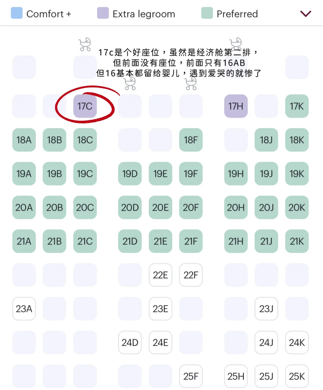 我选的第二排17AB,旁边17C虽然也是第二排,但前面没有座位,是可以伸长腿的,是个好座位✅ 如果怕吵的,不建议选17这排❌因为16排(经济舱第一排)基本都是留给带婴儿的,刚上飞机婴儿就一直哇哇哭,大家都很惆怅的戴上耳塞[失望R]
