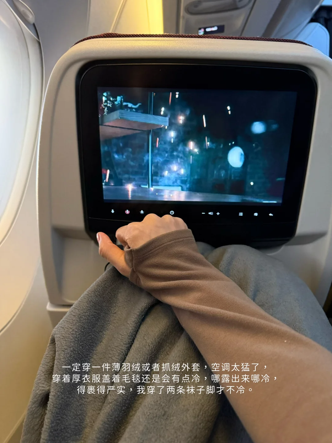 ‼️一定穿一件薄羽绒或者抓绒外套,卡塔尔航空空调太猛了,穿着厚衣服盖着毛毯还是会有点冷,哪露出来哪冷,得裹得严实,我穿了两条袜子脚才不冷。