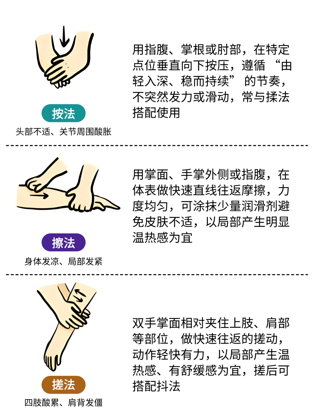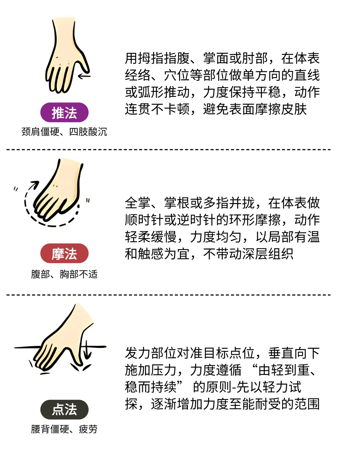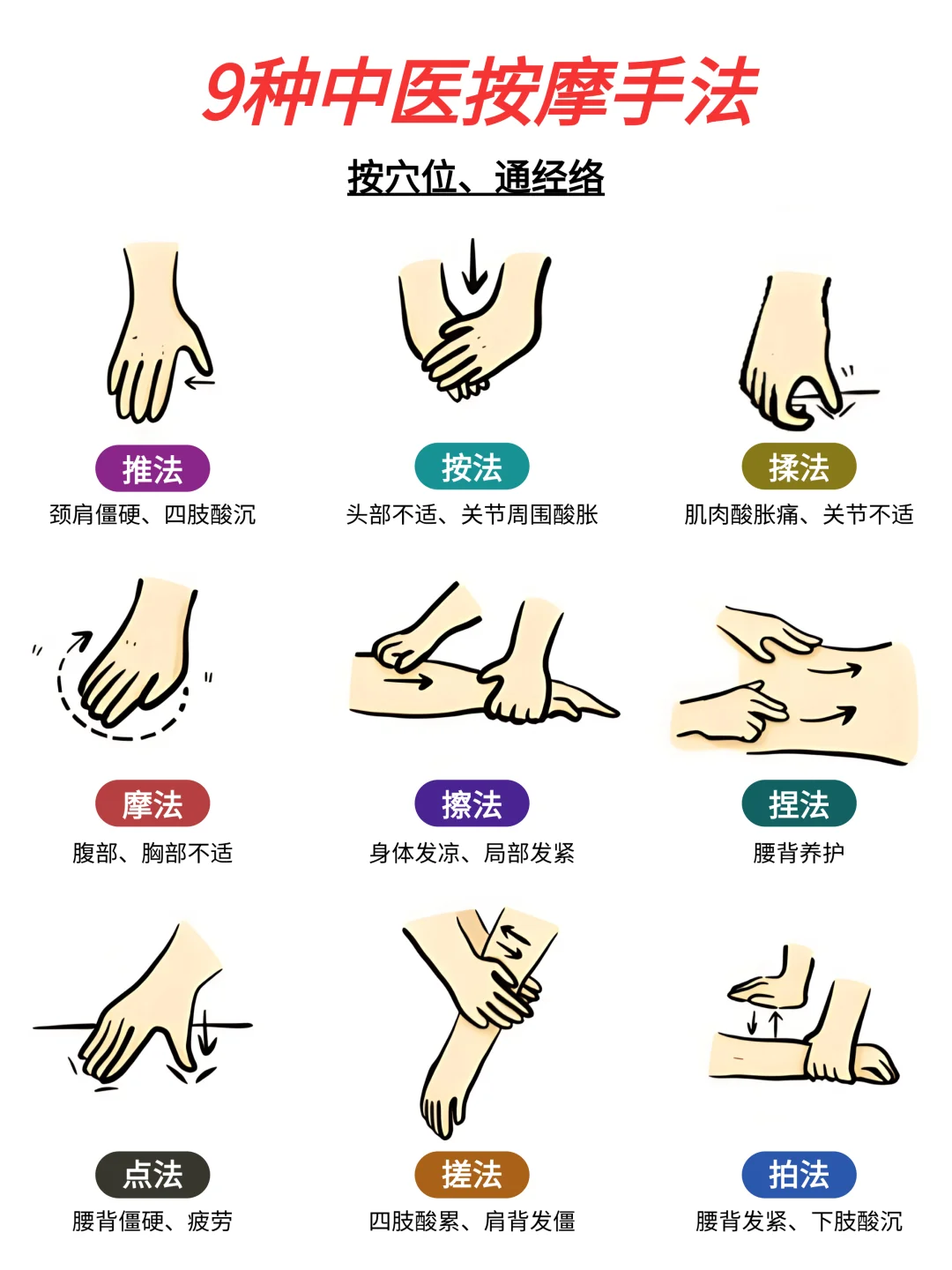 给宝子们分享9种实用的按摩手法 1⃣️推法 2⃣️按法 3⃣️揉法 4⃣️磨法 5⃣️擦法 6⃣️捏法 7⃣️点法 8⃣️搓法 9⃣️拍法