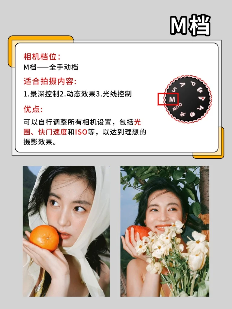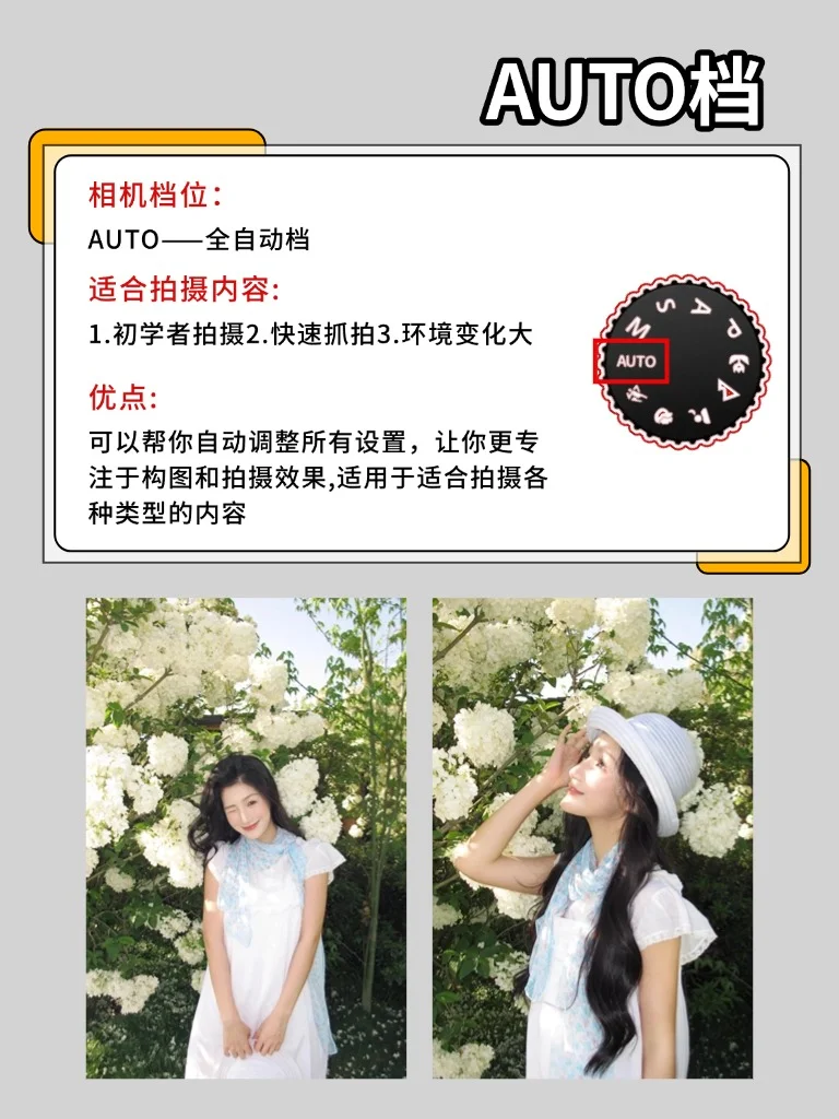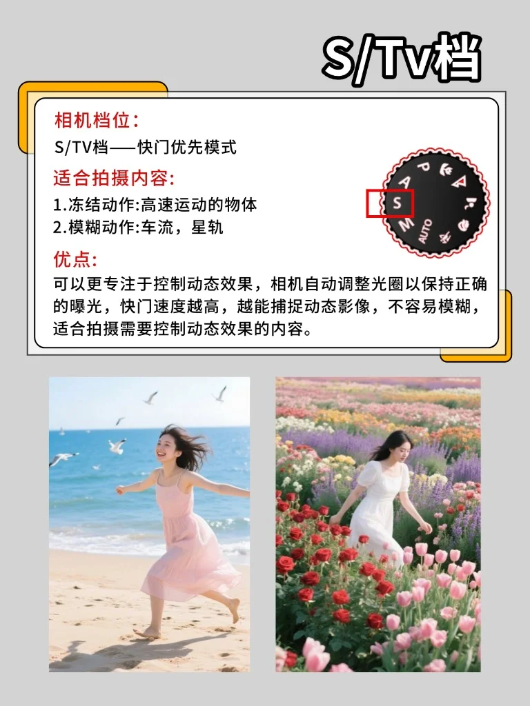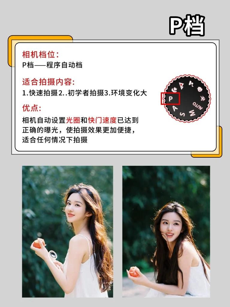 不同的相机档位适合拍什么场景? 1️⃣AUTO档是自动模式。 相机自动选择所有参数,适合手忙脚乱按快门的新手或快速抓拍。 适合光线复杂,需要快速拍摄的场景。 2️⃣P档是程序自动模式。 相机自动设置光圈和快门速度,我们可以手动调整ISO、曝光补偿等。 适合有一定基础,需要快速调整参数的场景。 3️⃣AV档光圈优先模式(A档/AV档)。 手动设置光圈,相机自动调整快门,控制虚化效果。 大光圈适合拍人像、小光圈适合拍风景。 4️⃣TV档是快门优先模式。 手动设置快门速度,相机自动选择光圈,控制动态效果。 适合拍运动摄影、流水拍摄,需要冻结瞬间或创造动态模糊。 5️⃣M档是全手动模式。 完全手动设置光圈、快门和ISO所有参数,适合创意摄影。 更适合有经验的摄影师,需要精确控制曝光。 摄影干货 摄影 摄影教程 摄影教学 摄影技巧 相机这5个档位,你都知道怎么用吗? 相机的不同档位会直接影响拍摄效果,那么这5个档位都有什么区别呢? 一、AUTO档是自动模式。 相机自动选择所有参数,适合手忙脚乱按快门的新手或快速抓拍。 适合光线复杂,需要快速拍摄的场景。 二、P档是程序自动模式。 相机自动设置光圈和快门速度,我们可以手动调整ISO、曝光补偿等。 适合有一定基础,需要快速调整参数的场景。 三、AV档光圈优先模式(A档/AV档)。 手动设置光圈,相机自动调整快门,控制虚化效果。 大光圈适合拍人像、小光圈适合拍风景。 四、TV档是快门优先模式。 手动设置快门速度,相机自动选择光圈,控制动态效果。 适合拍运动摄影、流水拍摄,需要冻结瞬间或创造动态模糊。 五、M档是全手动模式。 完全手动设置光圈、快门和ISO所有参数,适合创意摄影。 更适合有经验的摄影师,需要精确控制曝光。