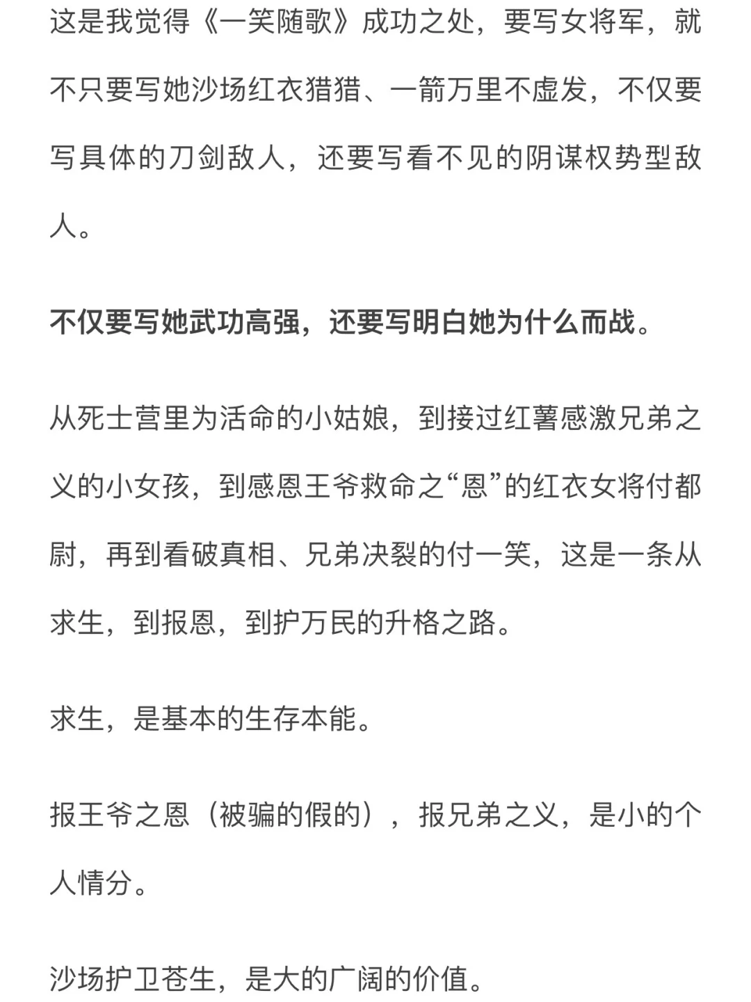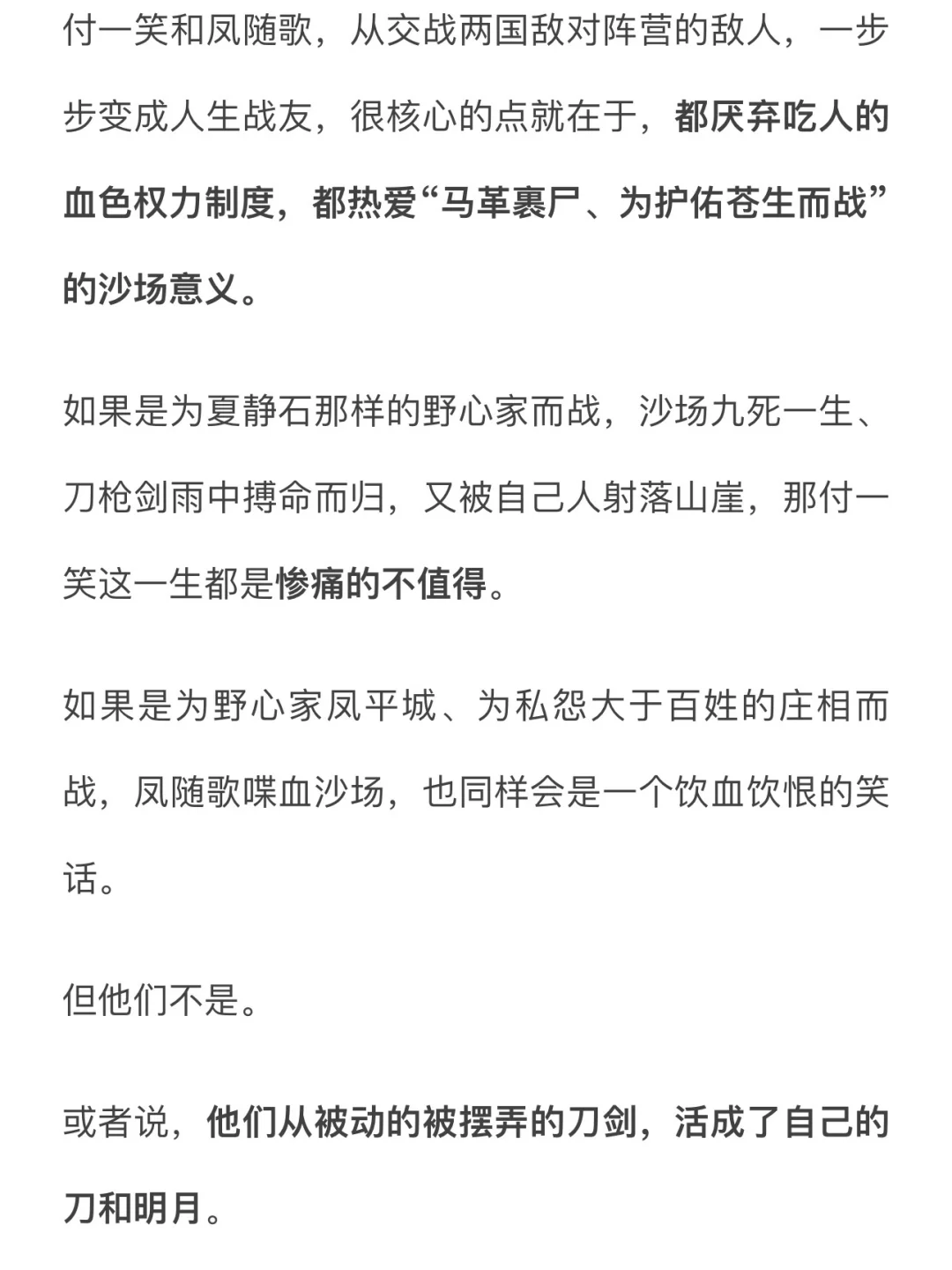 付一笑和凤随歌,从交战两国敌对阵营的敌人,一步步变成人生战友,很核心的点就在于,都厌弃吃人的血色权力制度,都热爱“马革裹尸、为护佑苍生而战”的沙场意义