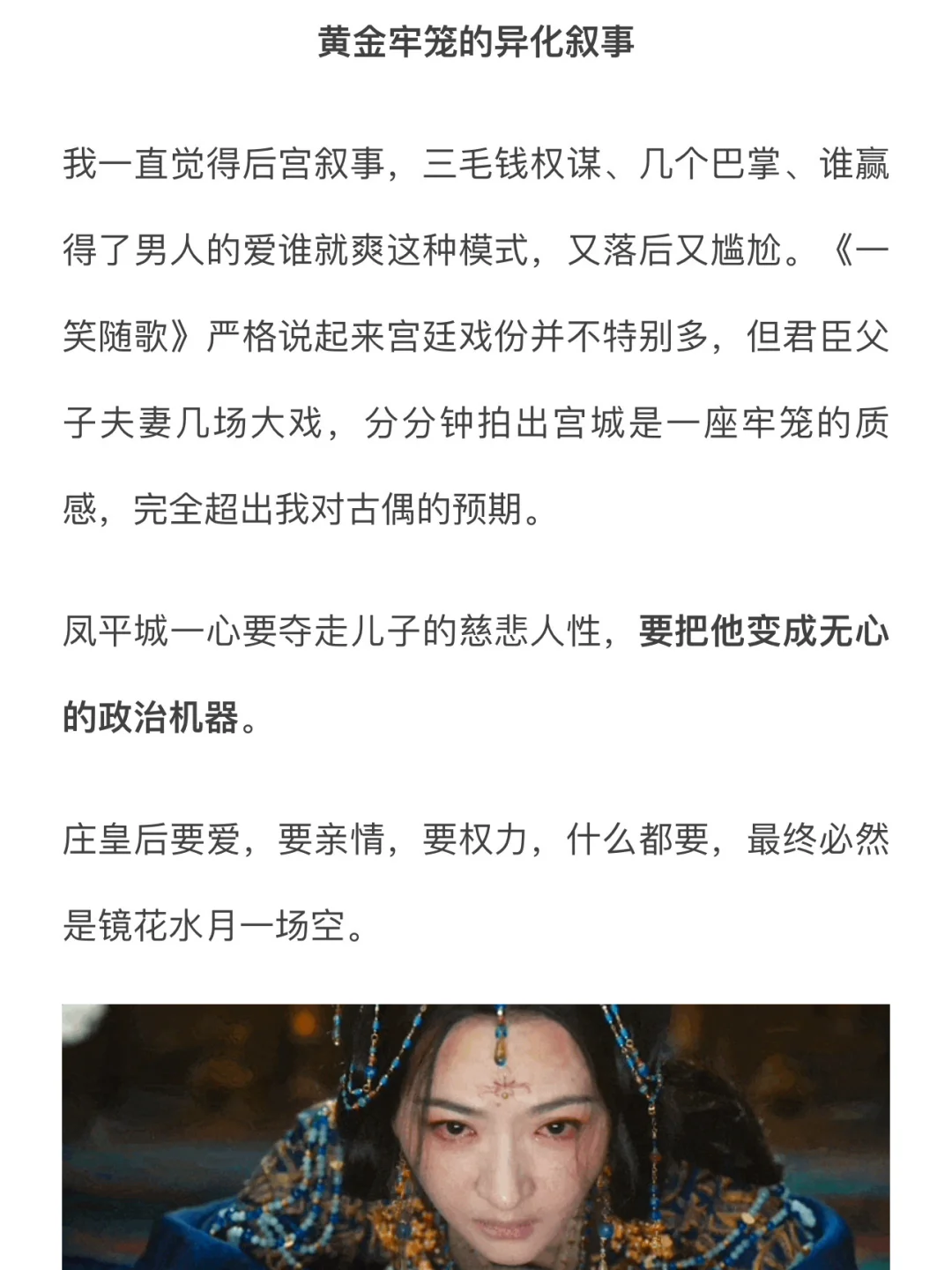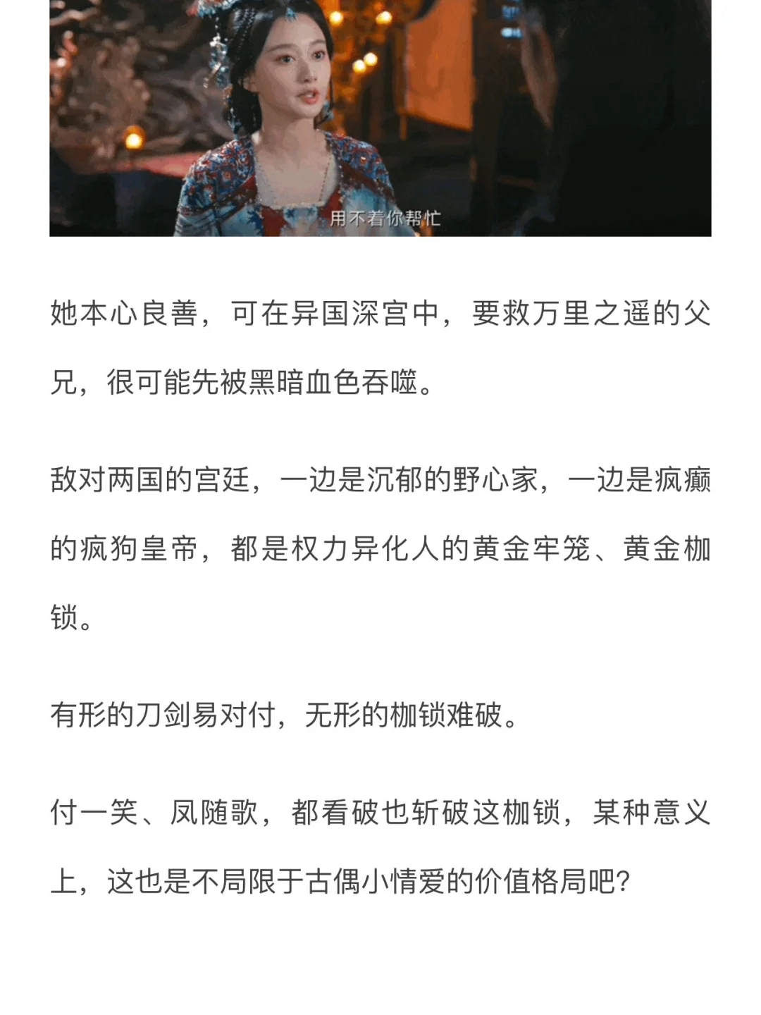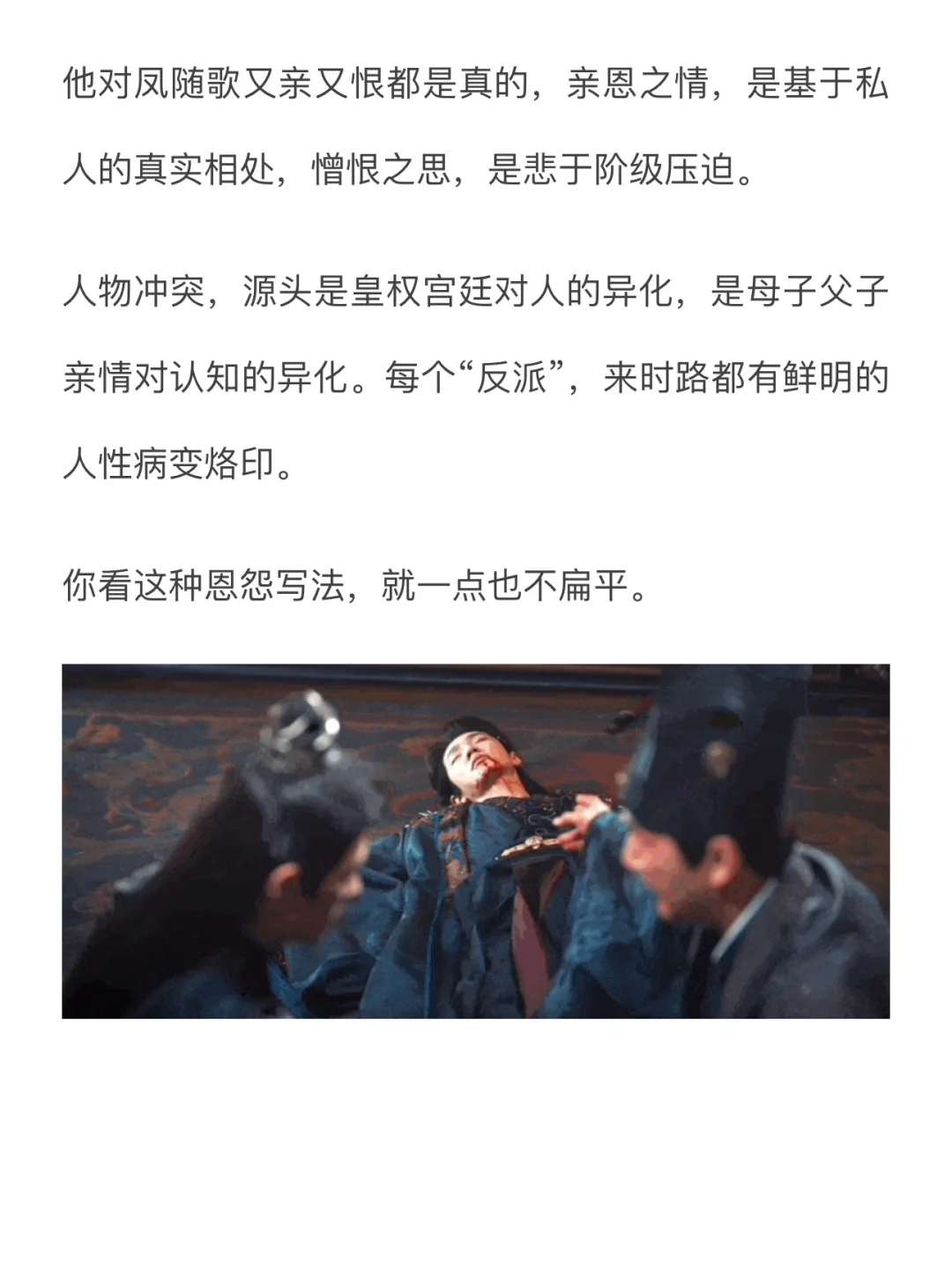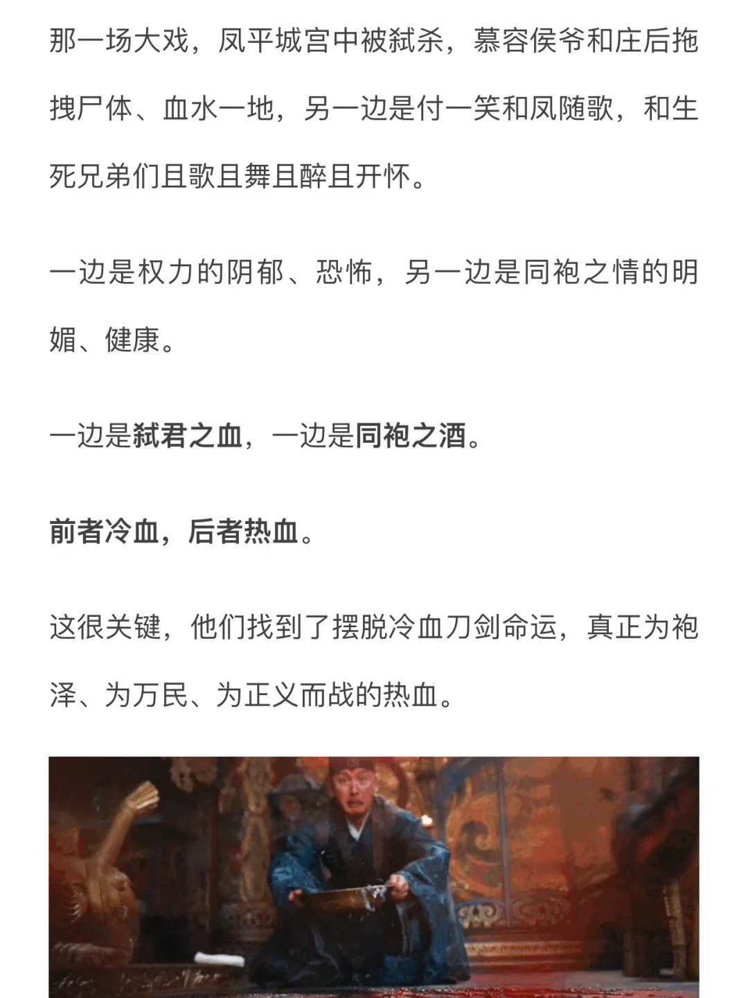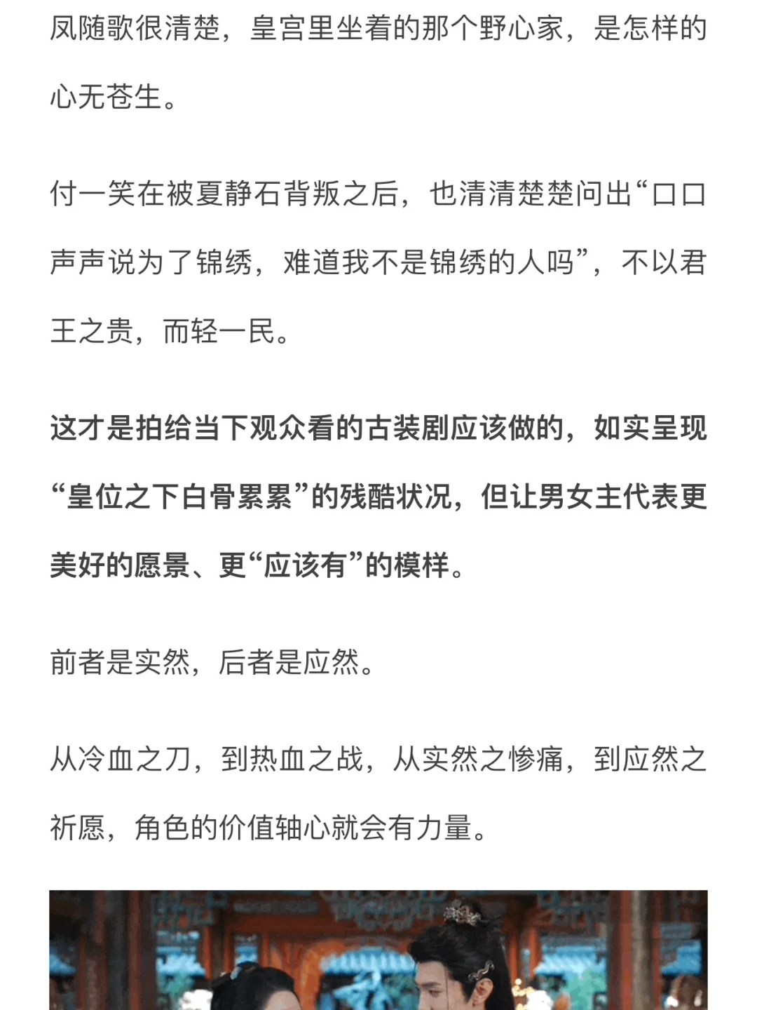 这才是拍给当下观众看的古装剧应该做的,如实呈现“皇位之下白骨累累”的残酷状况,但让男女主代表更美好的愿景、更“应该有”的模样