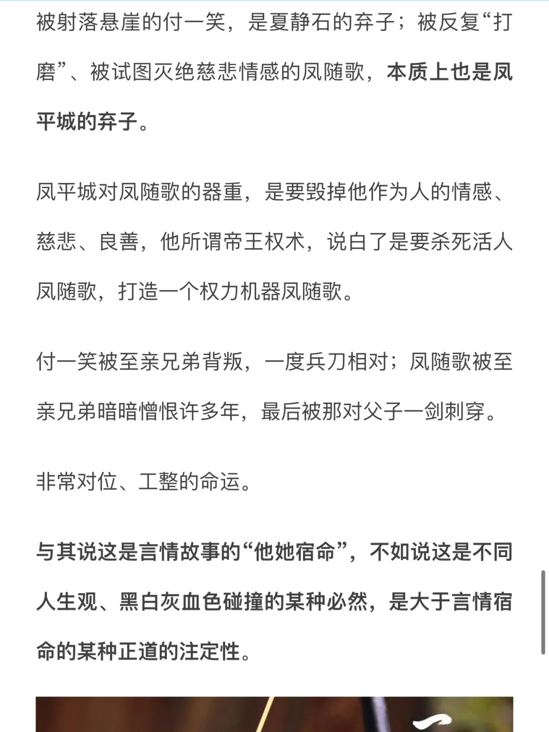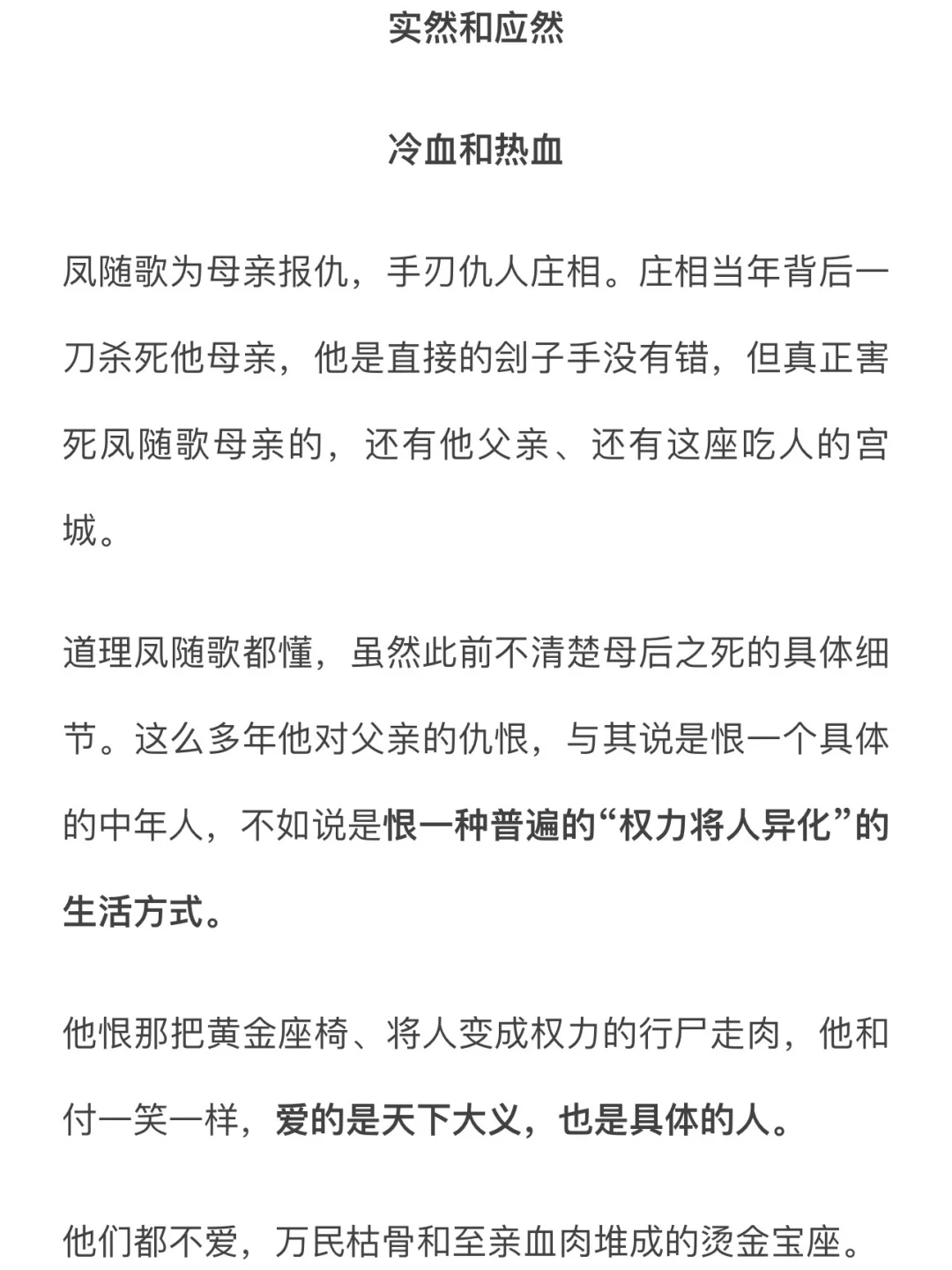 道理凤随歌都懂,虽然此前不清楚母后之死的具体细节。这么多年他对父亲的仇恨,与其说是恨一个具体的中年人,不如说是恨一种普遍的“权力将人异化”的生活方式
