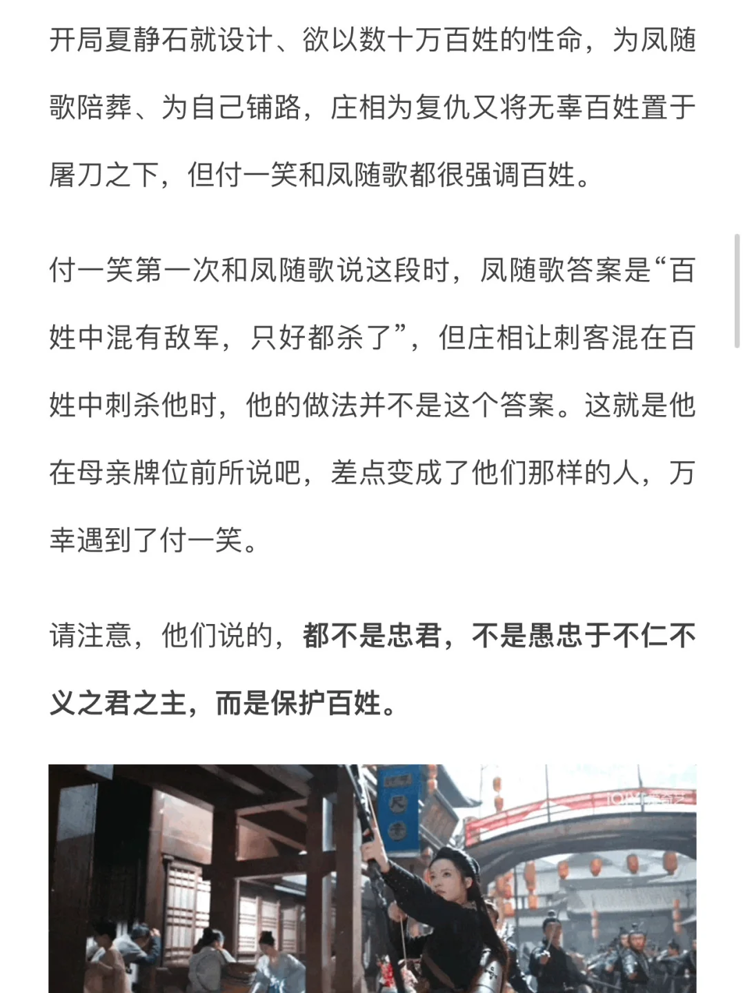 开局夏静石就设计、欲以数十万百姓的性命,为凤随歌陪葬、为自己铺路,庄相为复仇又将无辜百姓置于屠刀之下,但付一笑和凤随歌都很强调百姓