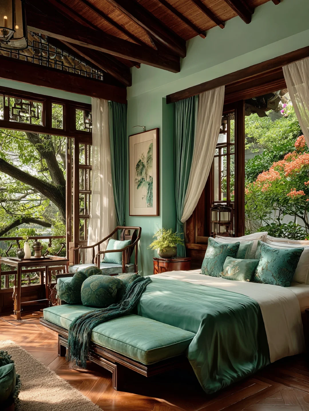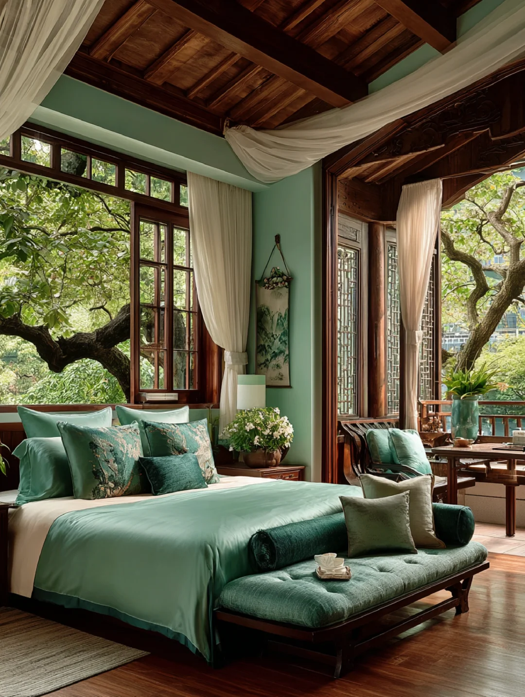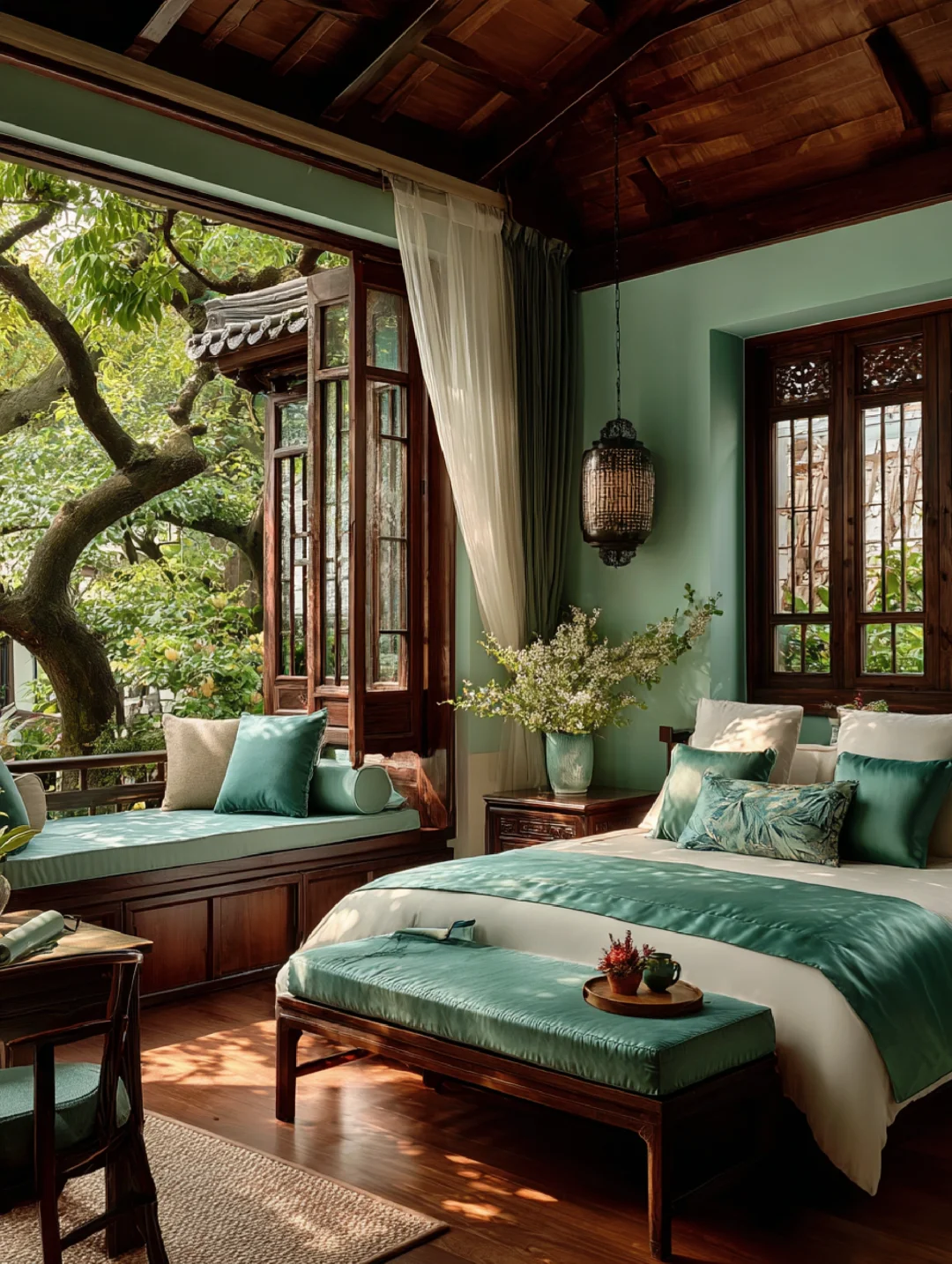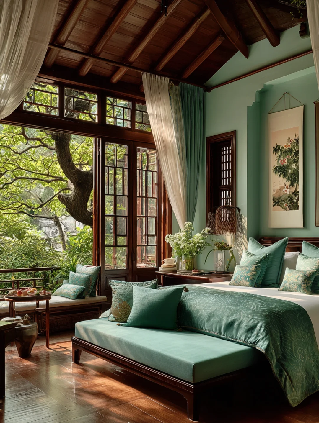 推开门那刻!呼吸都变轻了🍃 水墨浅青的墙面上,绿树与阳光共舞 浅青丝绢床品像一汪春水淌进心尖 新中式的清冷感里,居然藏着温柔暴击✨ 原来新中式不止有红木的厚重 当浅青撞上水墨 竟然美成了一首宋词 【作品为ai辅助创作】